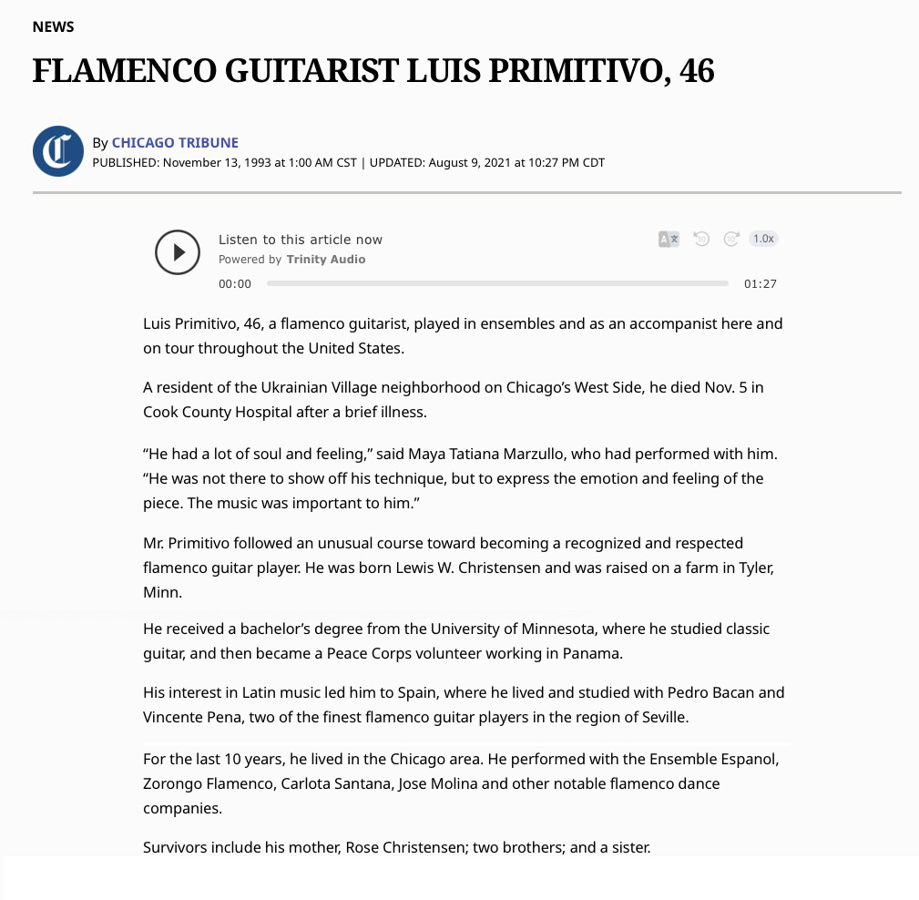 To my surprise, he did!  In fact, they were good friends!  He told me that he had buried his friend in 1994, a shock to me, as I have trouble acknowledging our shared mortalities.  They had known each other in the years shortly after my own connection with Louie.   By then, Louie had established himself in the specialized flamenco world of the Midwest.  His personal work in the art had become a distinct style, “primitivo”, an indication of the emotional passion that infused his performances.  He took on the moniker “Luis Primitivo” and eventually moved to Chicago, where he became well-known in the local flamenco community.