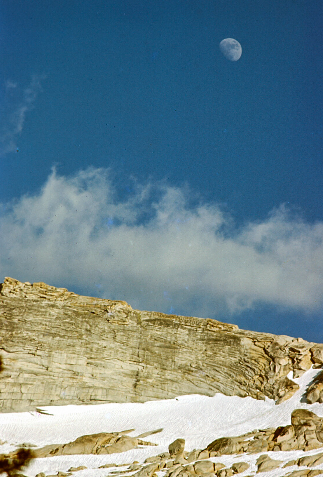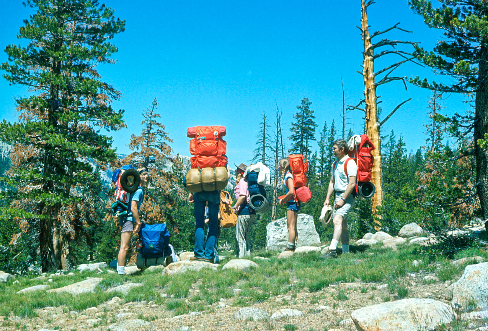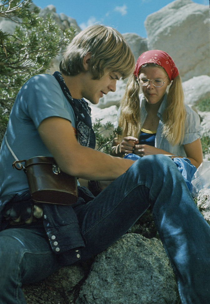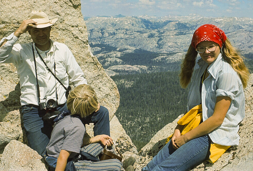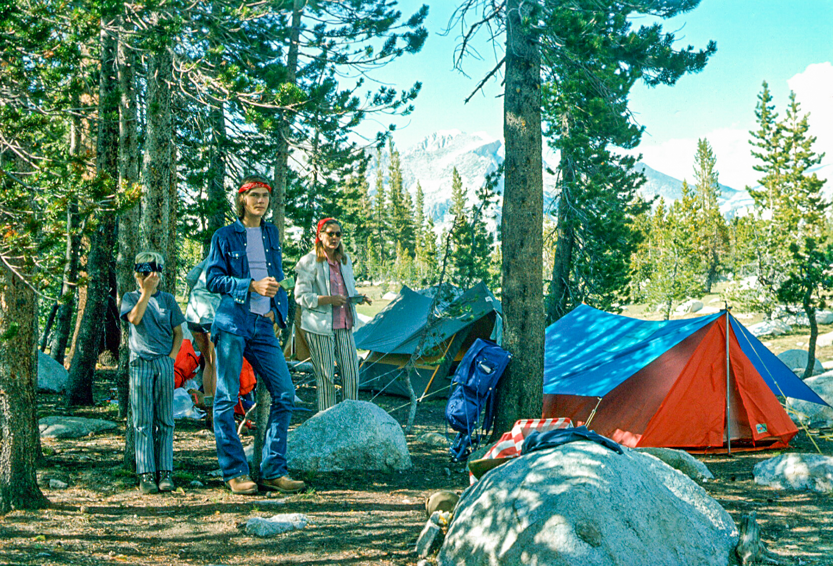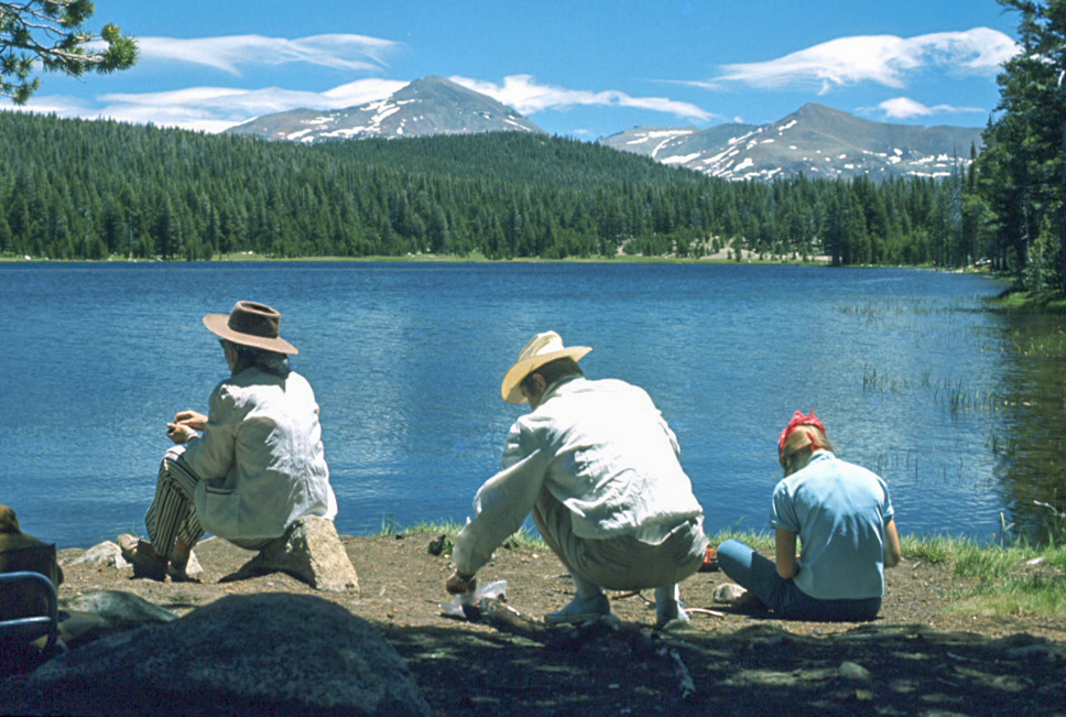 A view of the Bonneville heading for Tioga Pass... before the breakdown. A stop at an overlook. Thor, Lynn, John, Jackie, Eric, Laurie. Checking the maps in the VW. This was the workhorse vehicle that shuttled us all to the trailhead. On the trail! Yosemite scenery as we hike near Tuolumne Meadows Stopping for a drink and fording the stream Lunch break. Packs are arranged as a wind block We take a rest stop. A photo that captured us all on the trail. Tod, Lynn, John, Laurie, Thor, Jackie, Eric. We arrive at Lower Young Lake Eric and Laurie share some trail gorp. This rock provided a good view of the camp kitchen. Lynn and John Tents are set up A moment of rest after the full day Late afternoon at Young Lake Moonrise Ragged Peak Climbing Ragged Peak The climb involves clambering through chimneys
