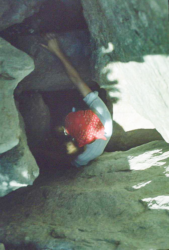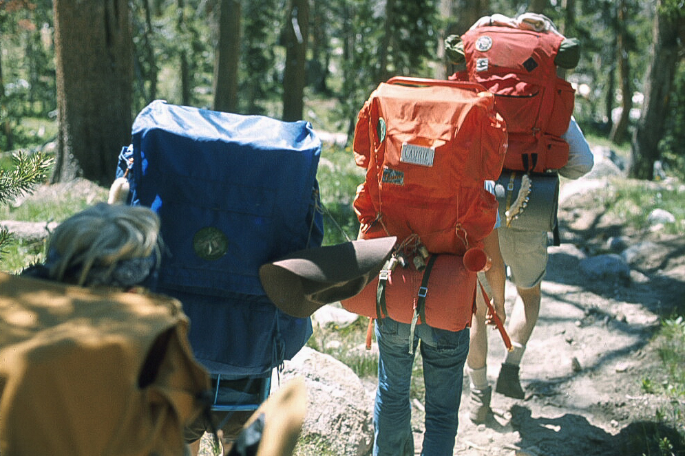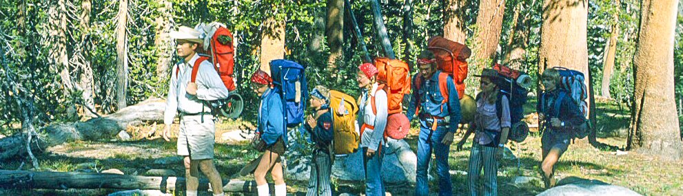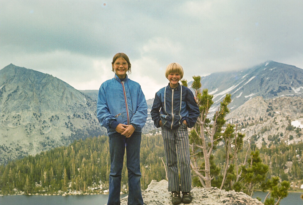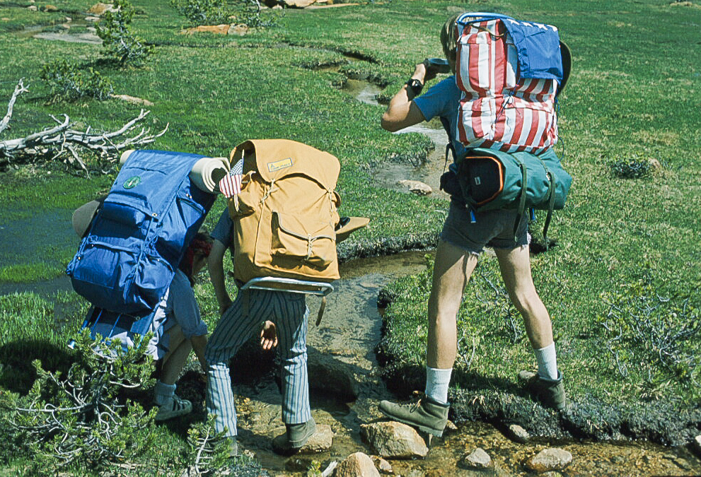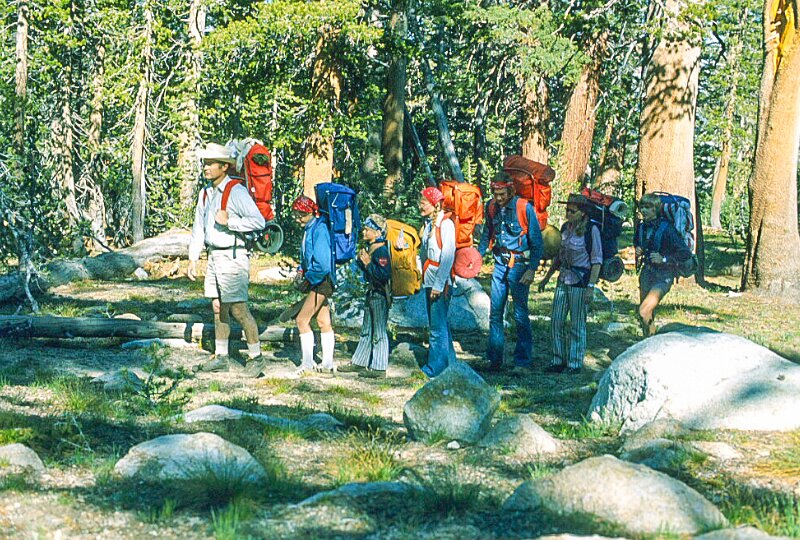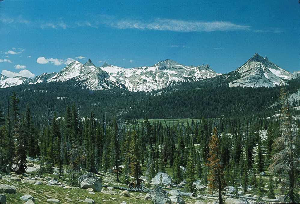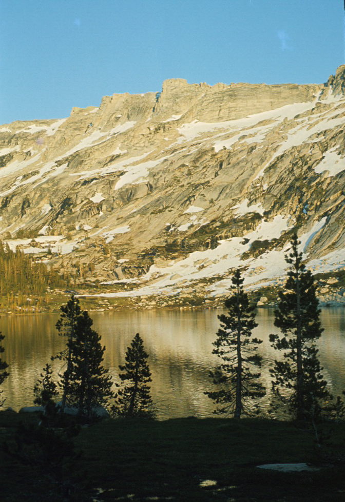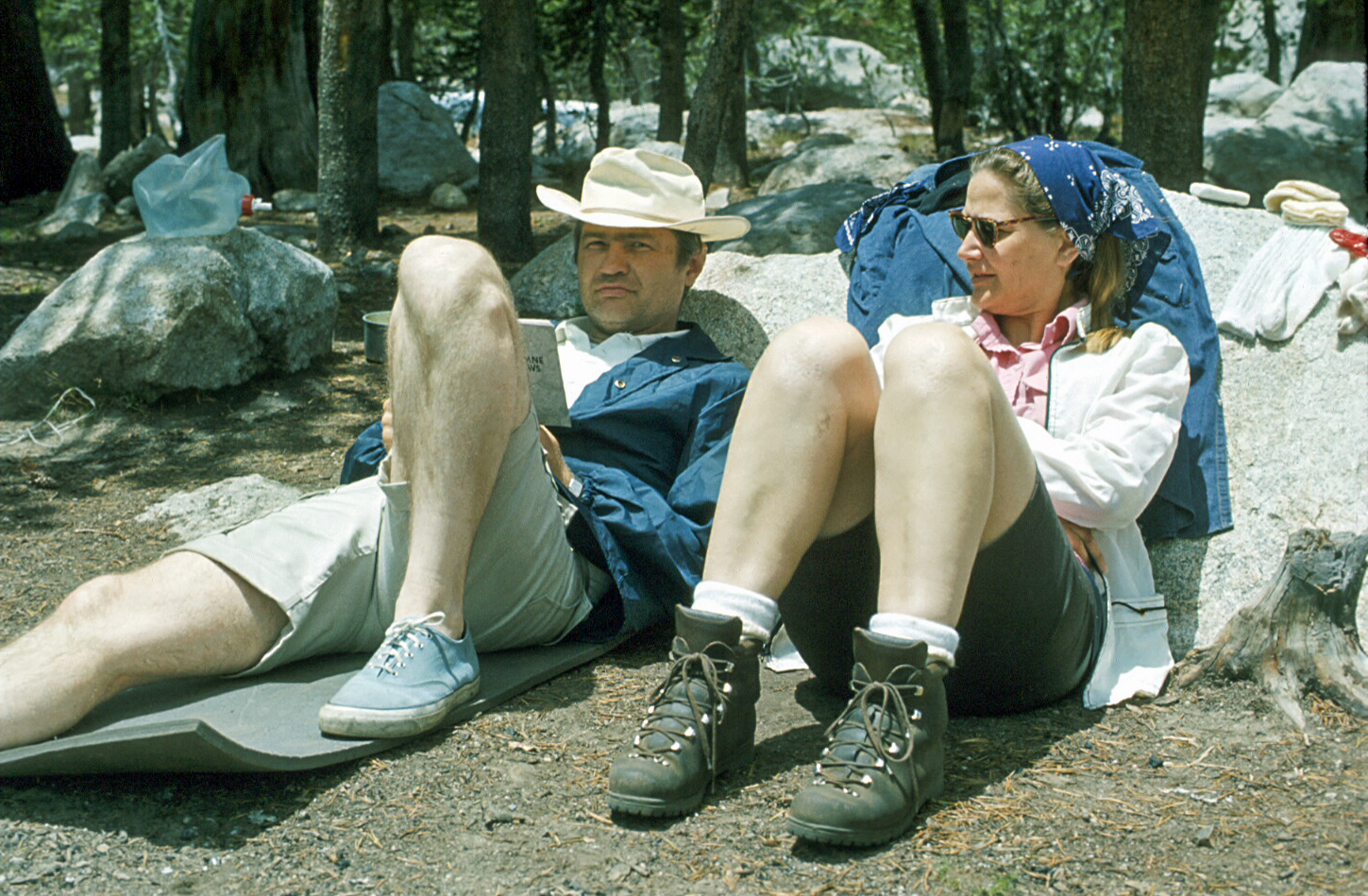 A view of the Bonneville heading for Tioga Pass... before the breakdown. A stop at an overlook. Thor, Lynn, John, Jackie, Eric, Laurie. Checking the maps in the VW. This was the workhorse vehicle that shuttled us all to the trailhead. On the trail! Yosemite scenery as we hike near Tuolumne Meadows Stopping for a drink and fording the stream Lunch break. Packs are arranged as a wind block We take a rest stop. A photo that captured us all on the trail. Tod, Lynn, John, Laurie, Thor, Jackie, Eric. We arrive at Lower Young Lake Eric and Laurie share some trail gorp. This rock provided a good view of the camp kitchen. Lynn and John Tents are set up A moment of rest after the full day Late afternoon at Young Lake Moonrise Ragged Peak Climbing Ragged Peak The climb involves clambering through chimneys