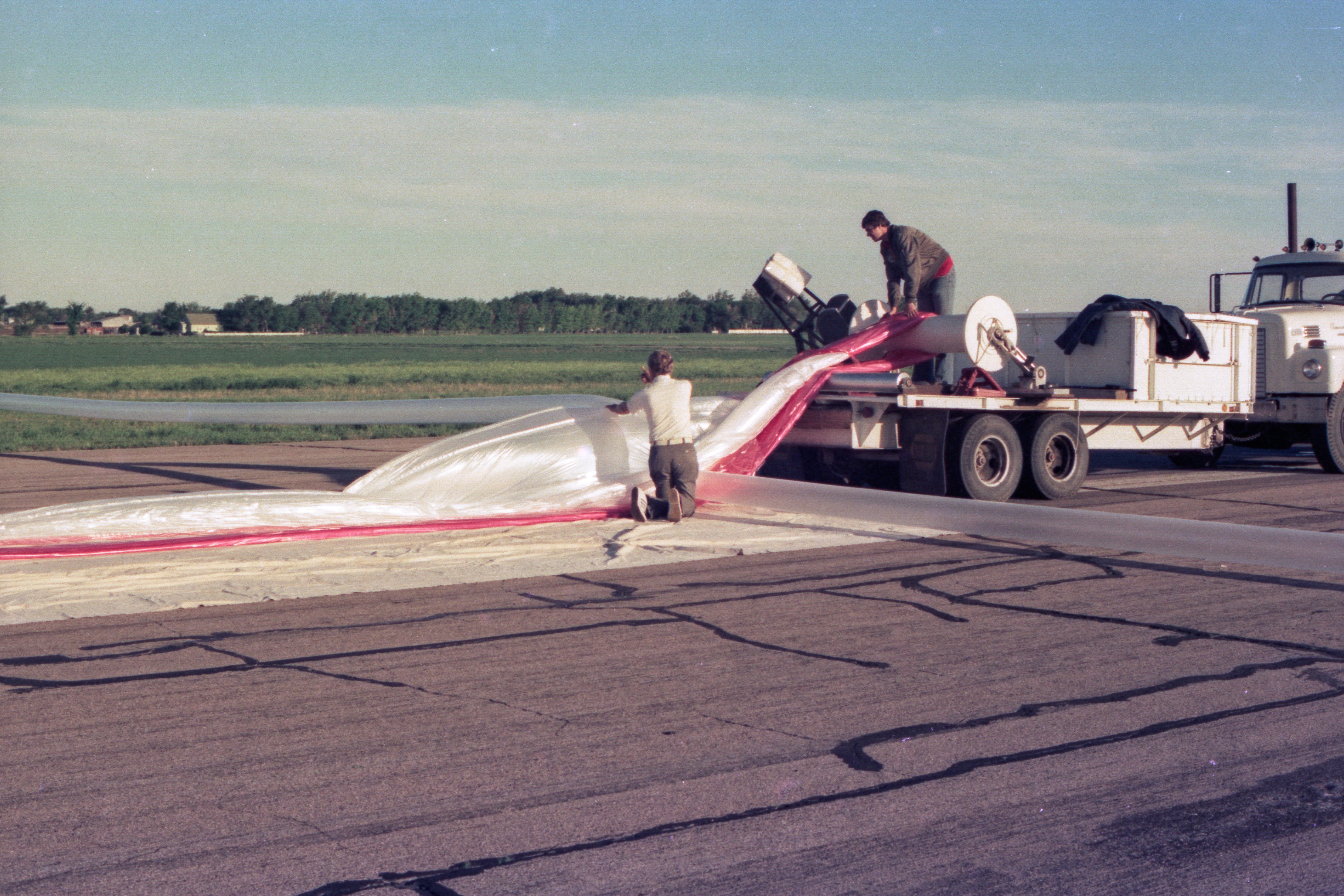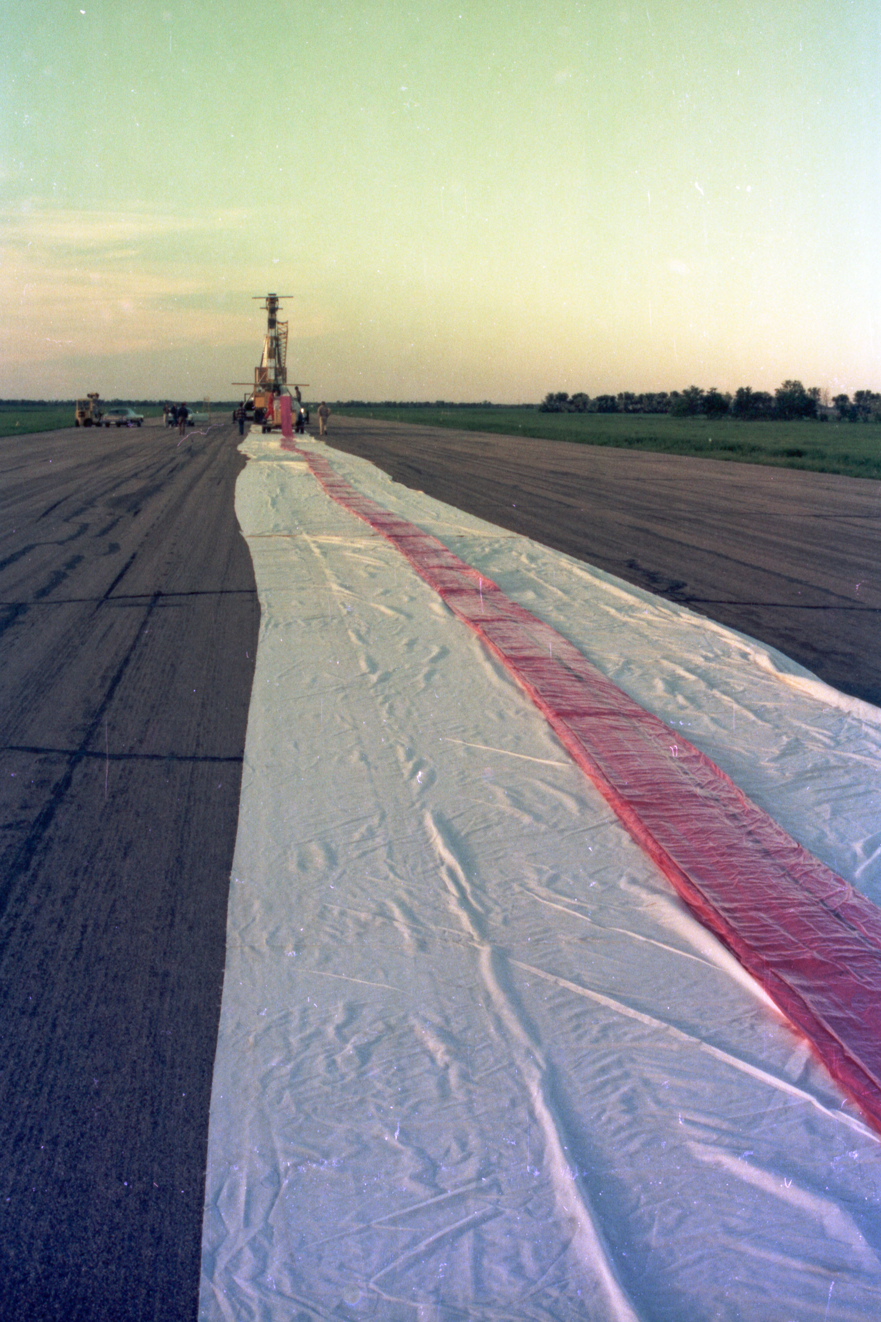 The balloon is still inside a red wrapper, and laid out on a white tarp protecting it from any sharp debris on the runway.