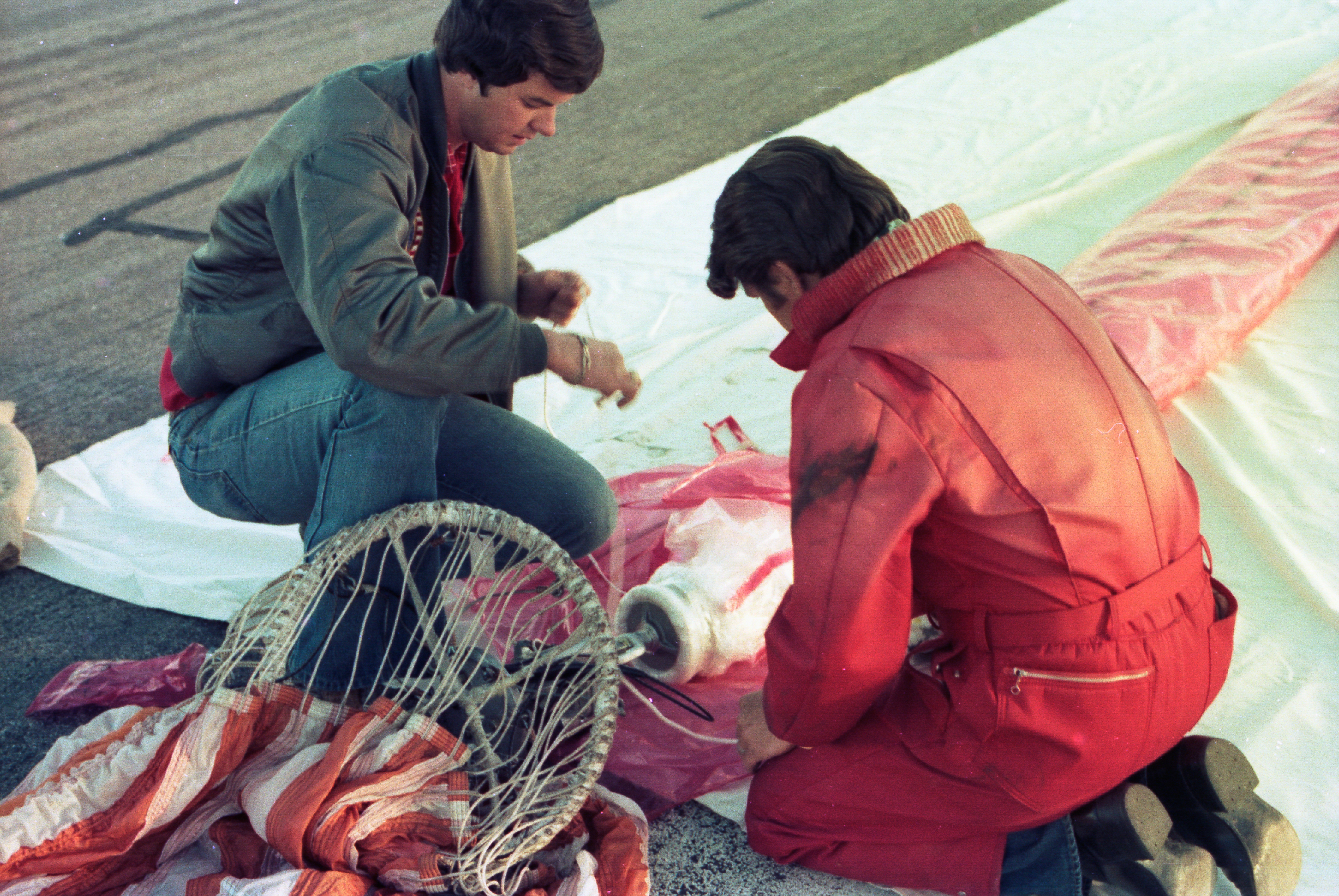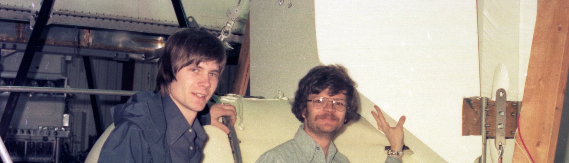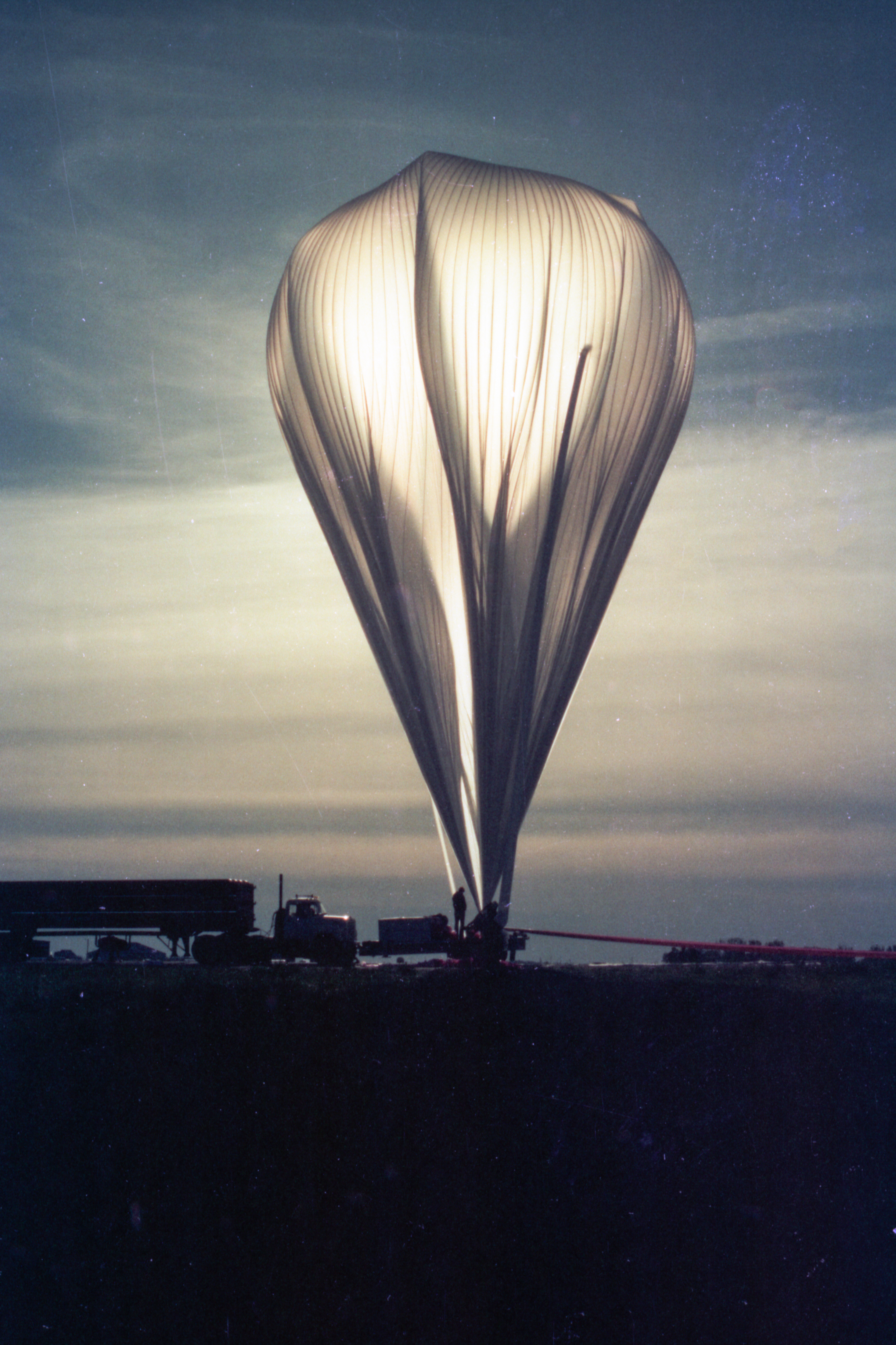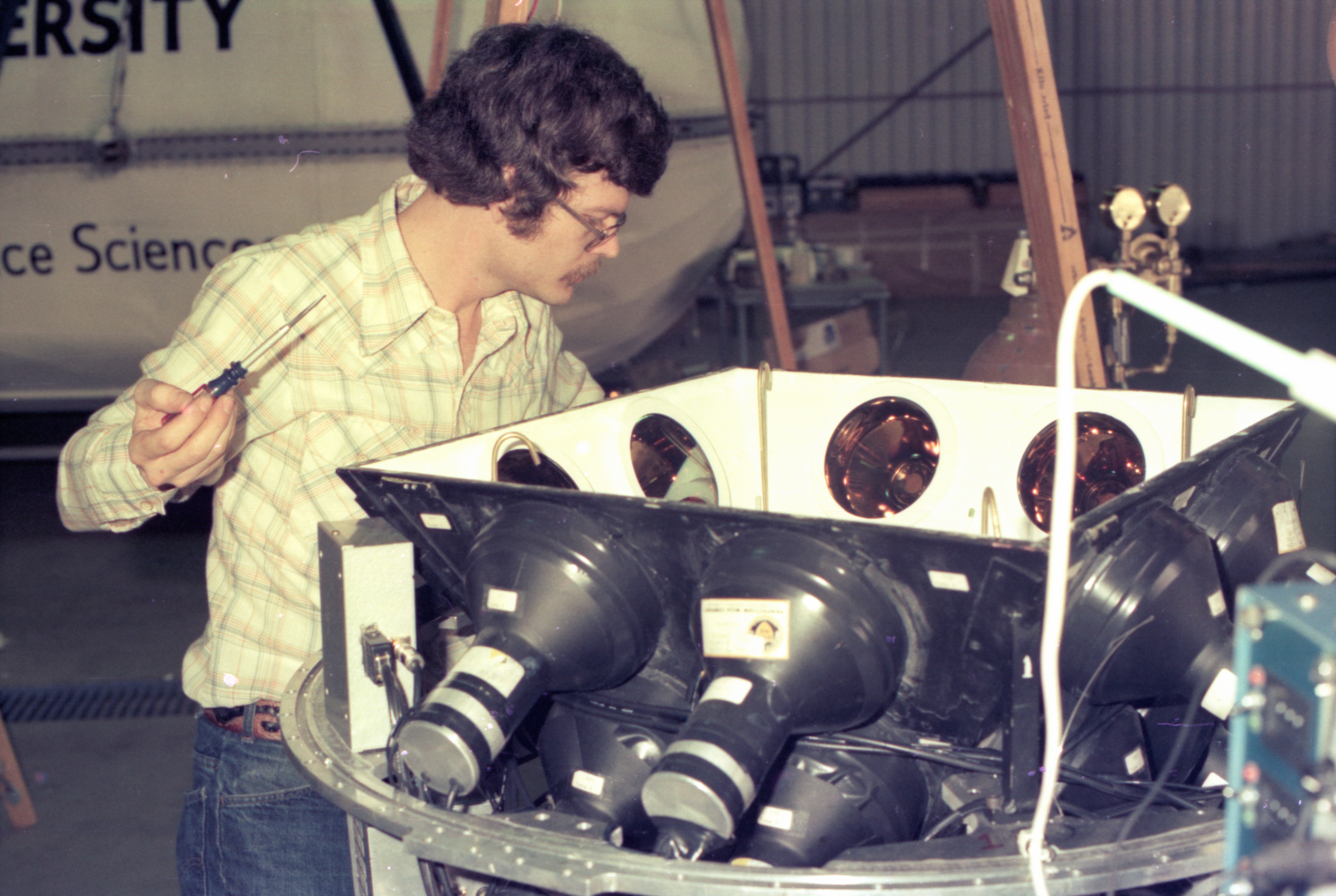 Cosmic ray instrument package with graduate students Chuck Gilman, Bob Scarlett, and principal investigator Dr. C J Waddington (not pictured: co-PI Phyllis Freier).