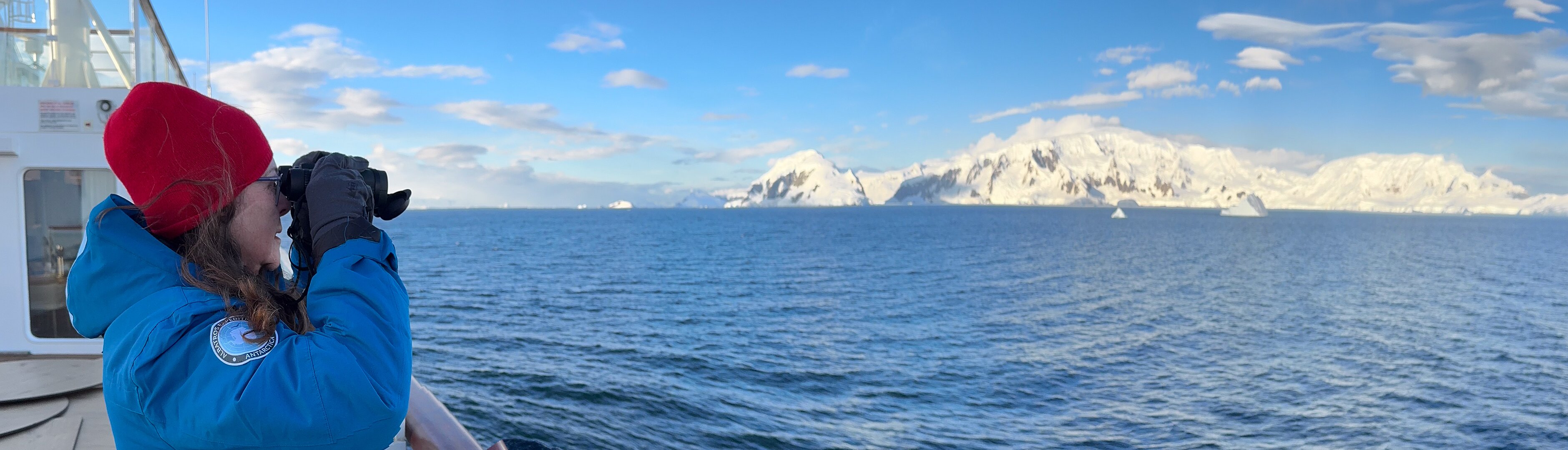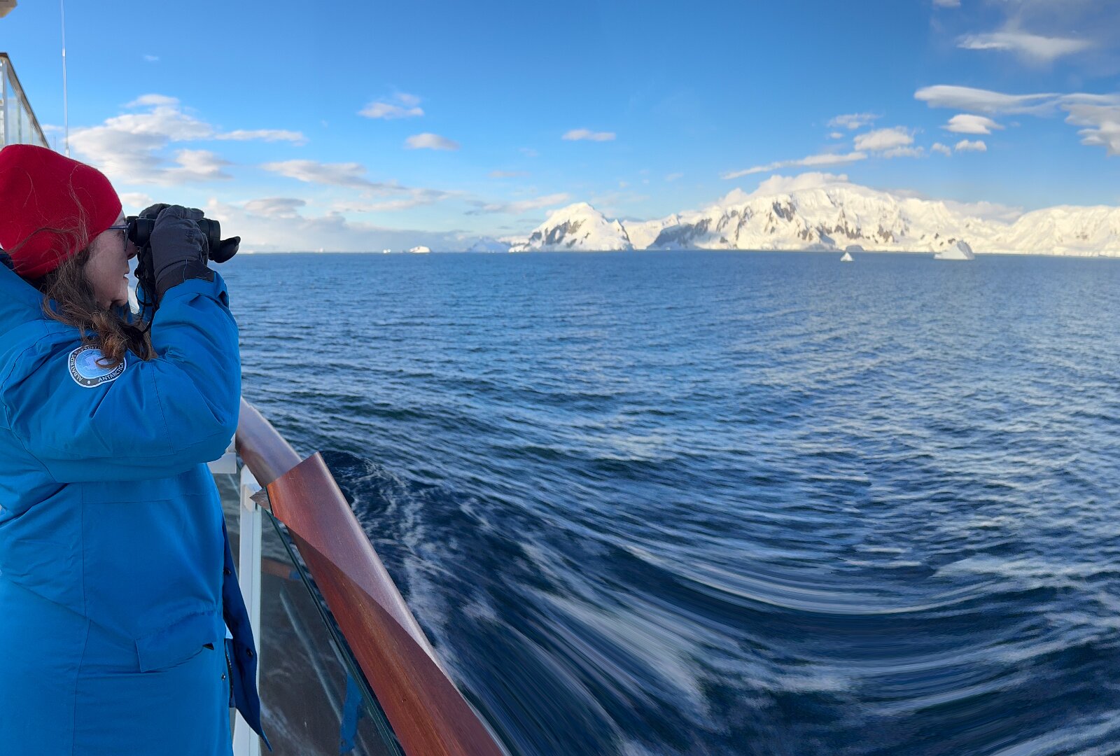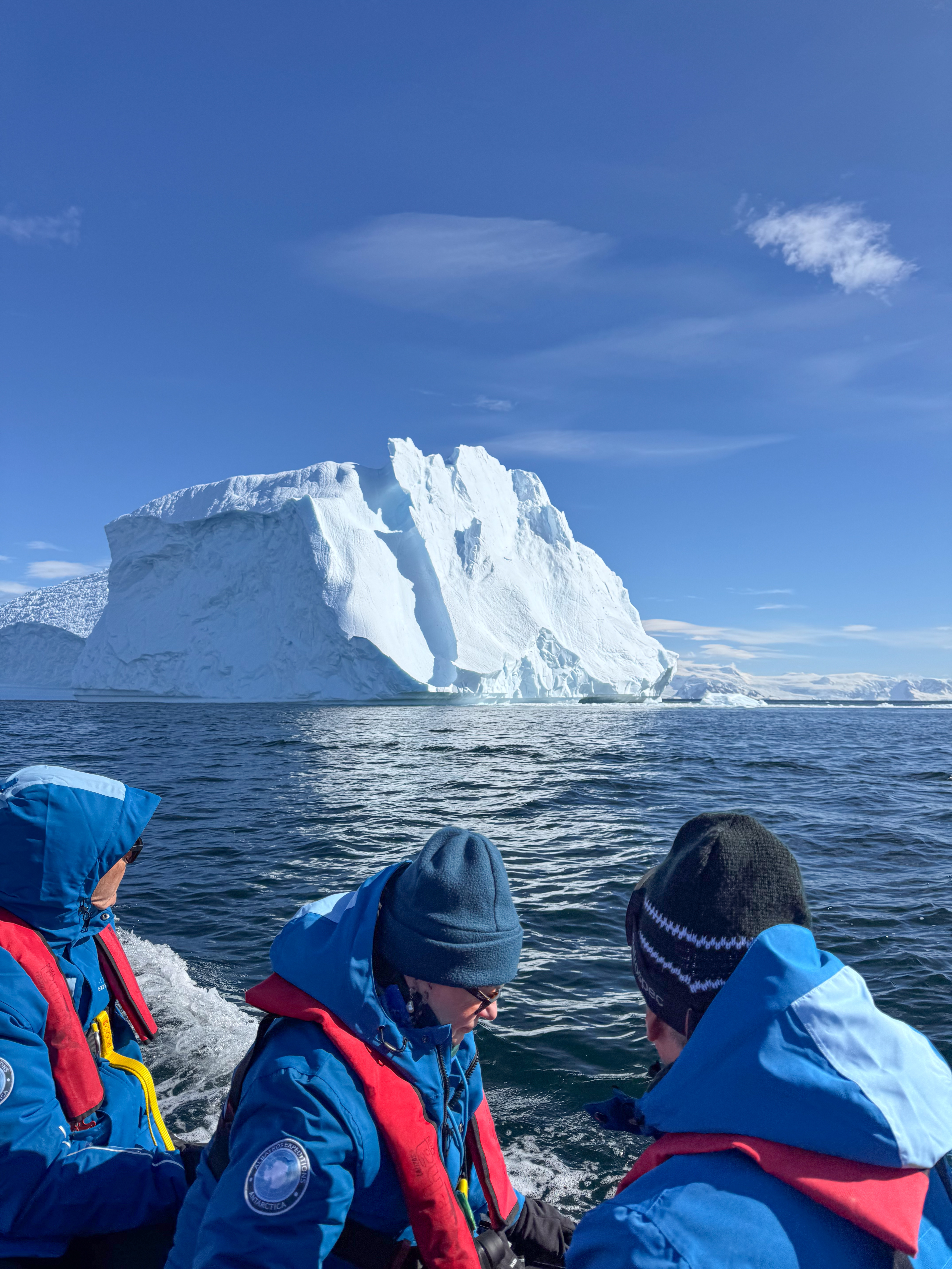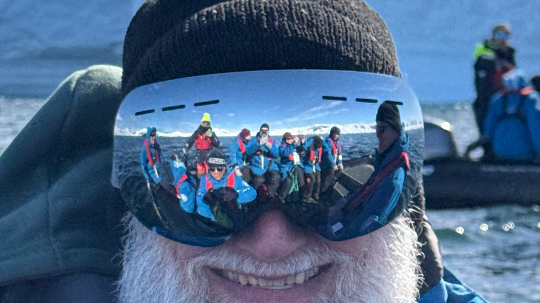 It's 6 am and the sun is well up. Poldi looks for wildlife. Seabirds cluster and feed. Morning light on Antarctica. We begin a zodiac cruise, passing this iceberg. Kevin, one of the avid photographers in our group. And here are the other passengers in the zodiac boat. A humpback whale dives. Our ship, as we leave it to explore Foyn Harbor. Ice sculptures. As we depart, other excursion boats return, navigating the ice floes in the way. More fantastice ice shapes. The wreck of a Norwegian whaling ship. It caught fire in 1915, and was run aground to save the crew, who were rescued by another whailing ship. An Arctic tern. Each zodiac boat was named. 2026-01-31 Barrientos Island2026-02-02 Port Lockroy
