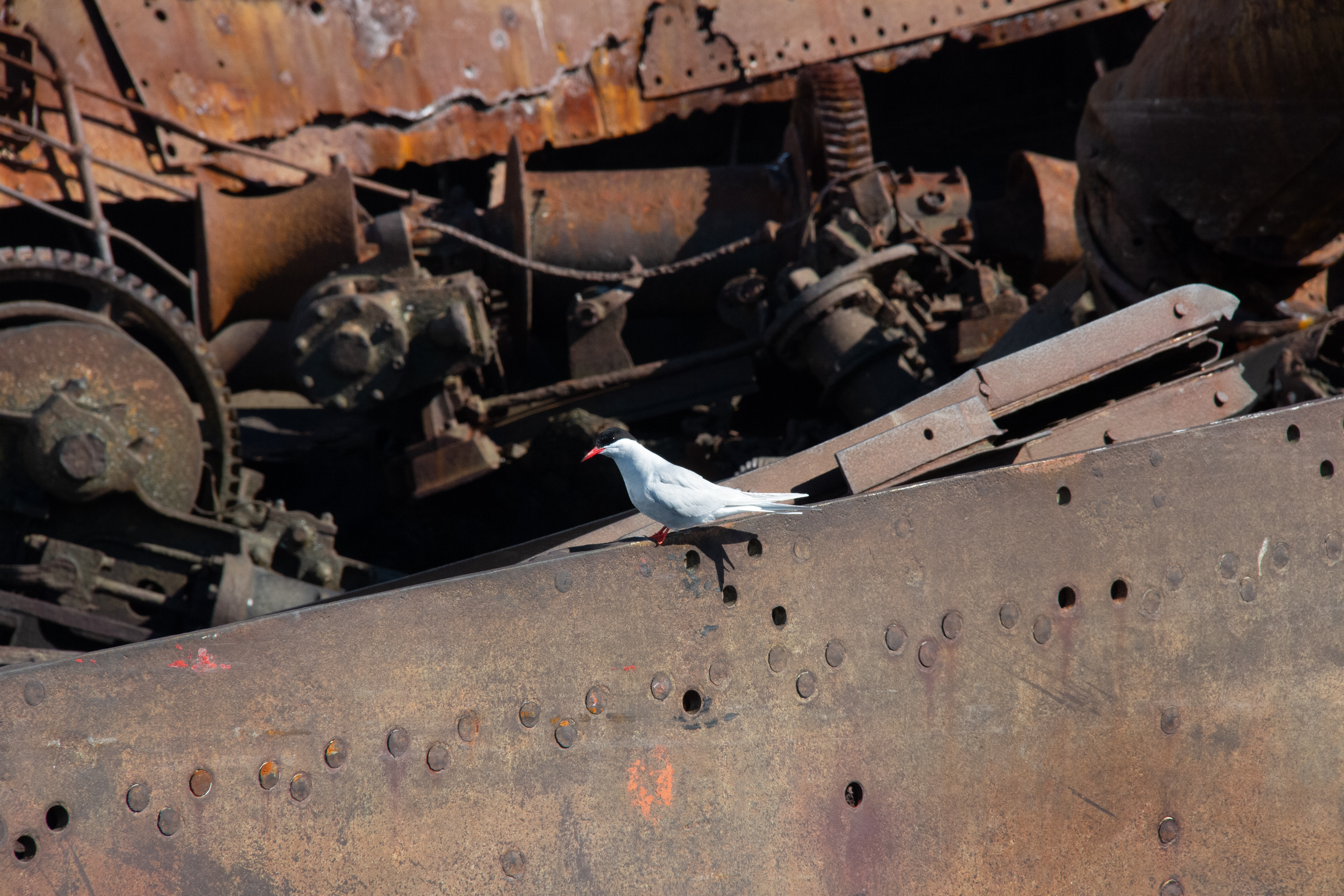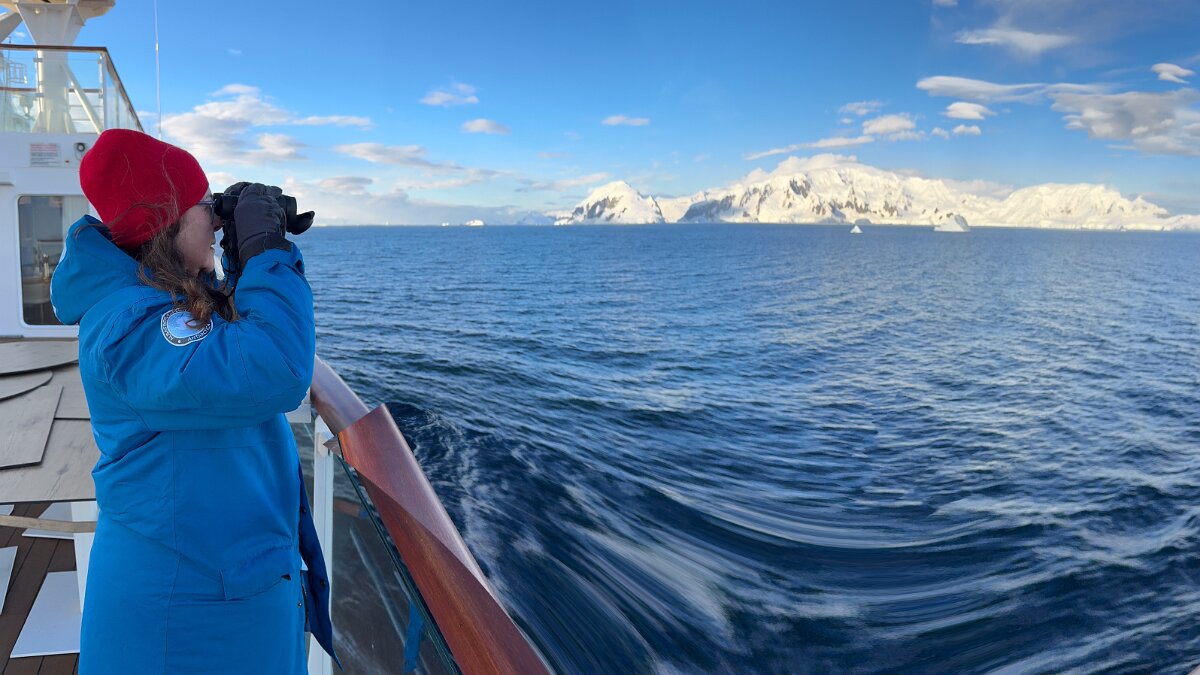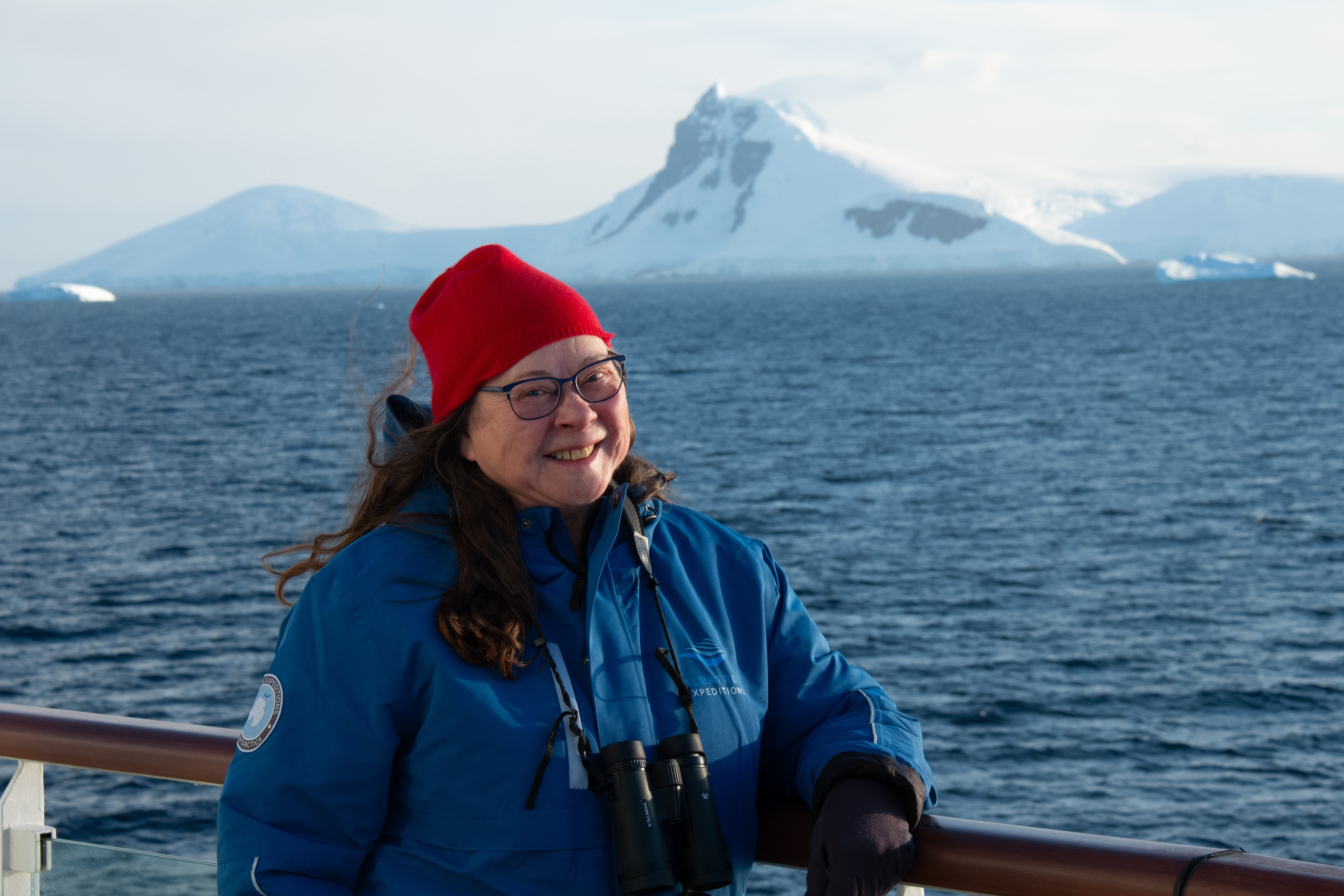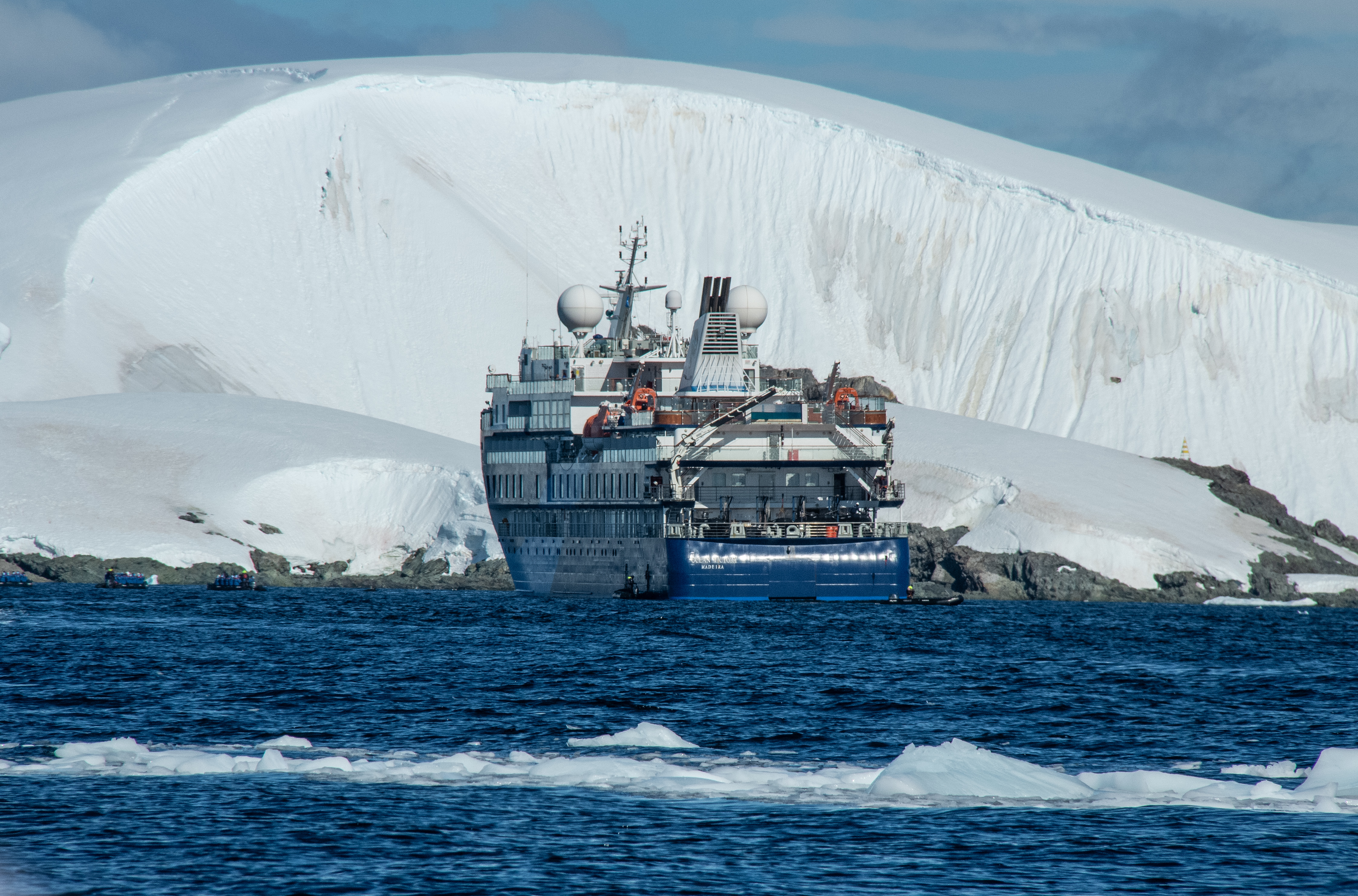 It's 6 am and the sun is well up. Poldi looks for wildlife. Seabirds cluster and feed. Morning light on Antarctica. We begin a zodiac cruise, passing this iceberg. Kevin, one of the avid photographers in our group. And here are the other passengers in the zodiac boat. A humpback whale dives. Our ship, as we leave it to explore Foyn Harbor. Ice sculptures. As we depart, other excursion boats return, navigating the ice floes in the way. More fantastice ice shapes. The wreck of a Norwegian whaling ship. It caught fire in 1915, and was run aground to save the crew, who were rescued by another whailing ship. An Arctic tern. Each zodiac boat was named. 2026-01-31 Barrientos Island2026-02-02 Port Lockroy