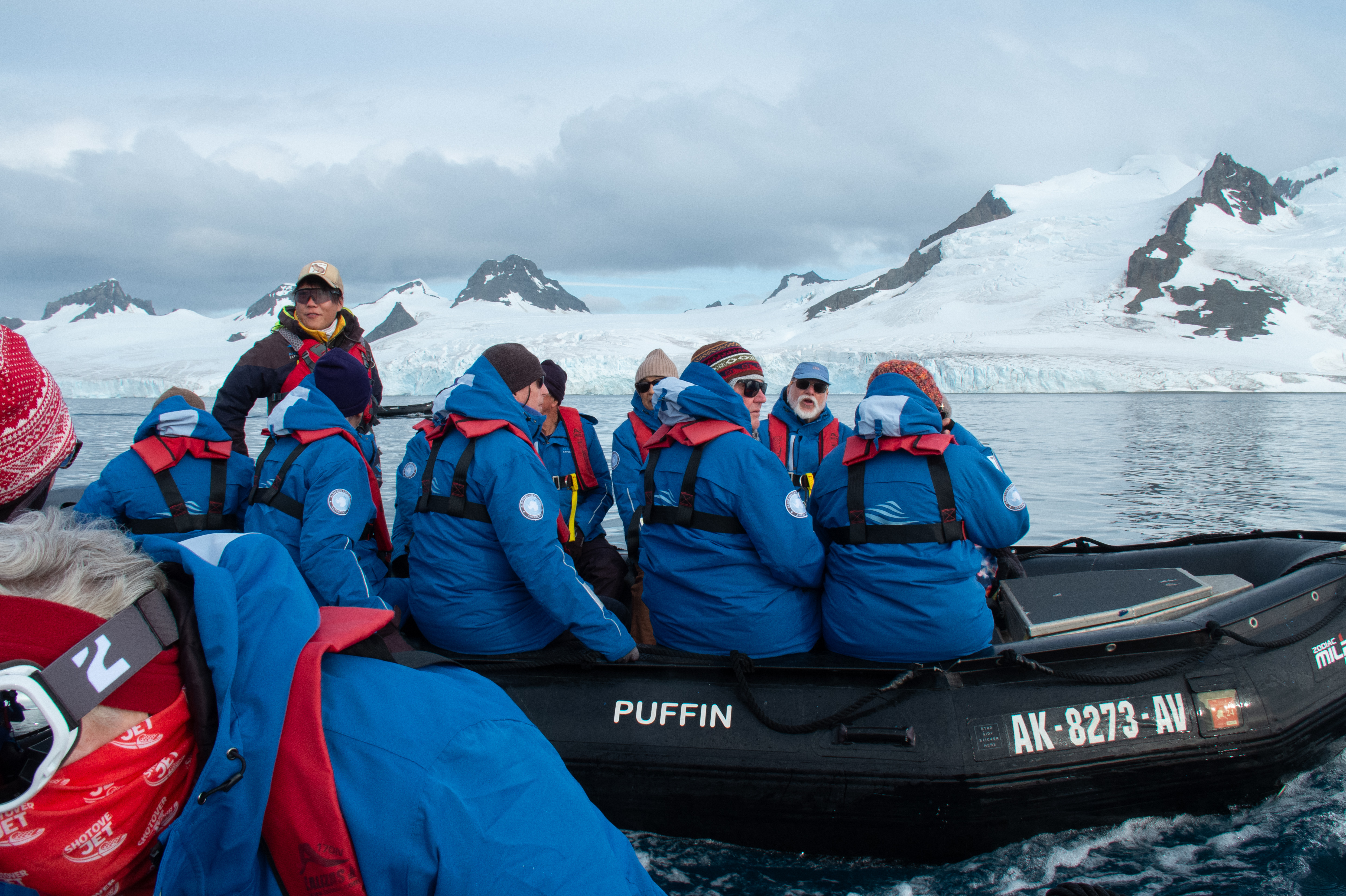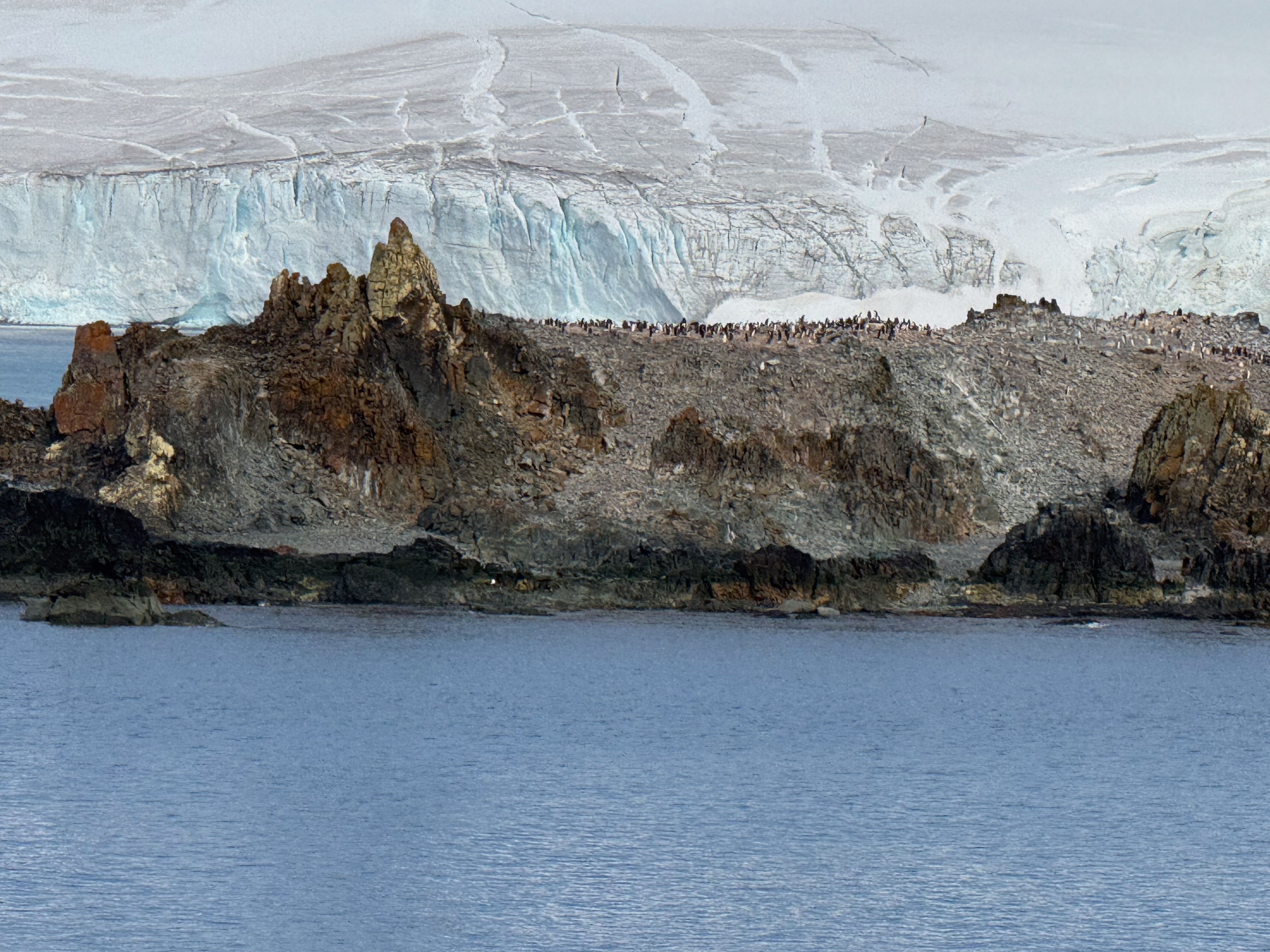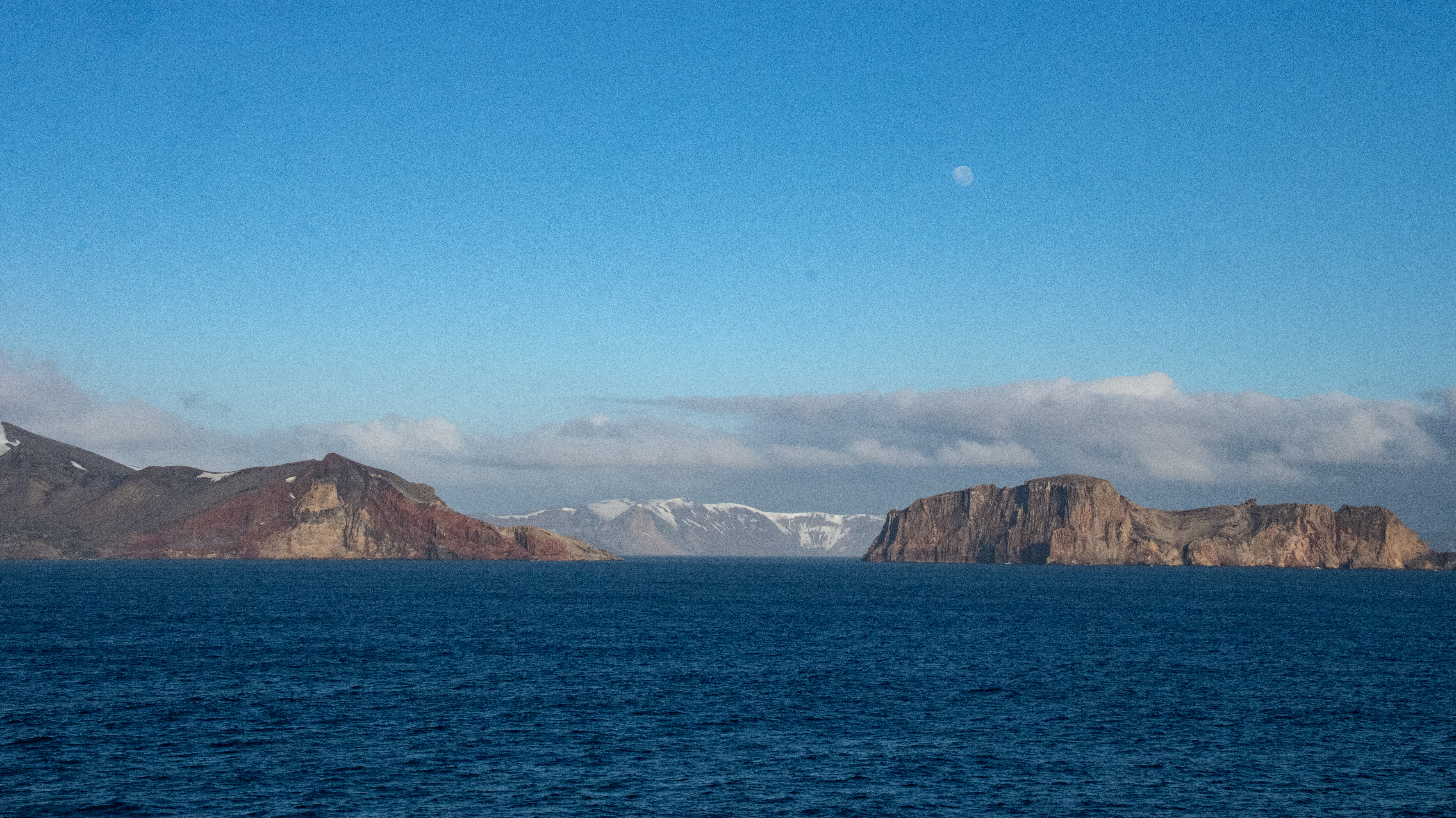 This is the darkest it will get tonight. The sun is 9-degrees below the horizon, but the full moon is 15-degrees up and illuminates distant icebergs and mountains.