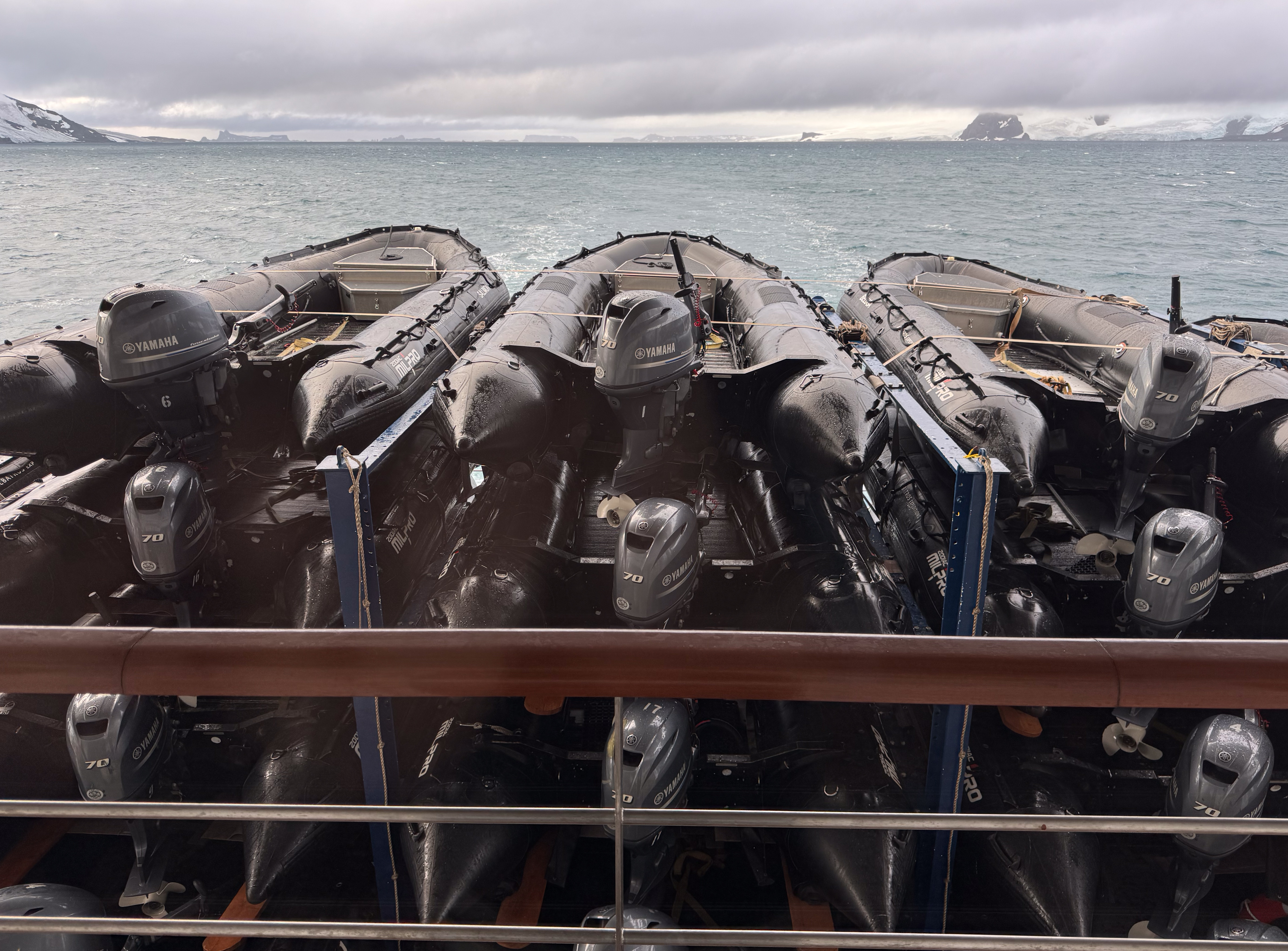 Each of our outings involved deploying the Zodiacs fromm their storage bay, performed with the assistance of two cranes. They were all put back into place at the end of each outing and the ship would navigate to the next destination.