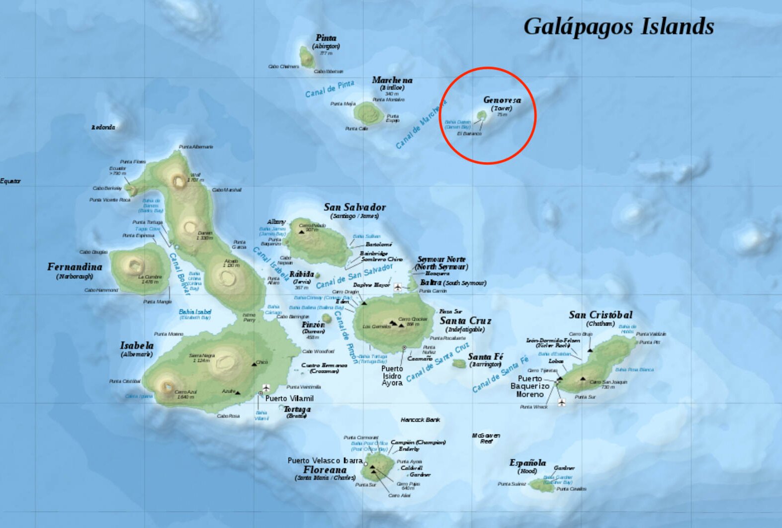 We awake in the perfectly circular Darwins Bay, the remnant of the volcano. A frigate bird flies near the rim of the crater wall.