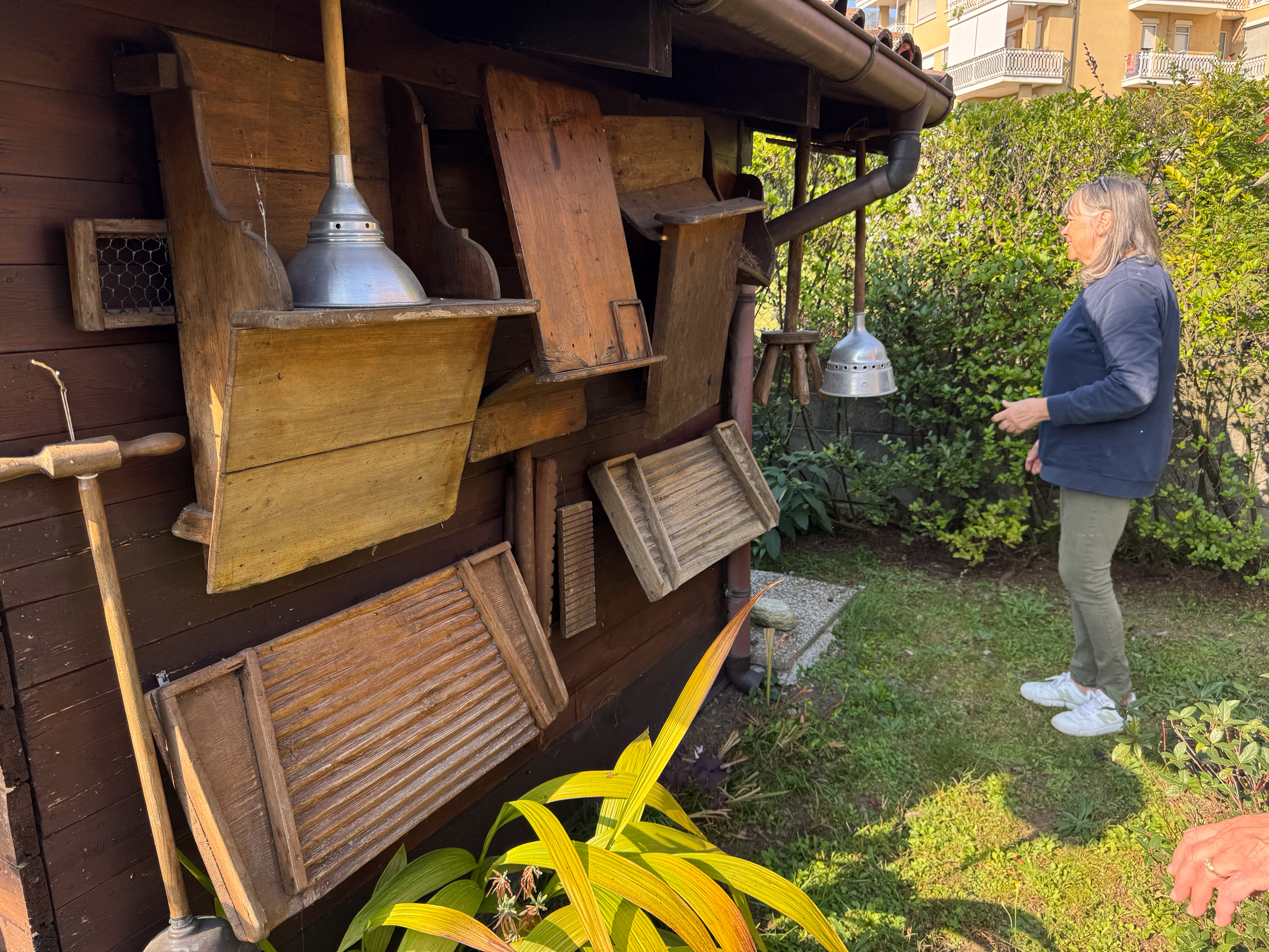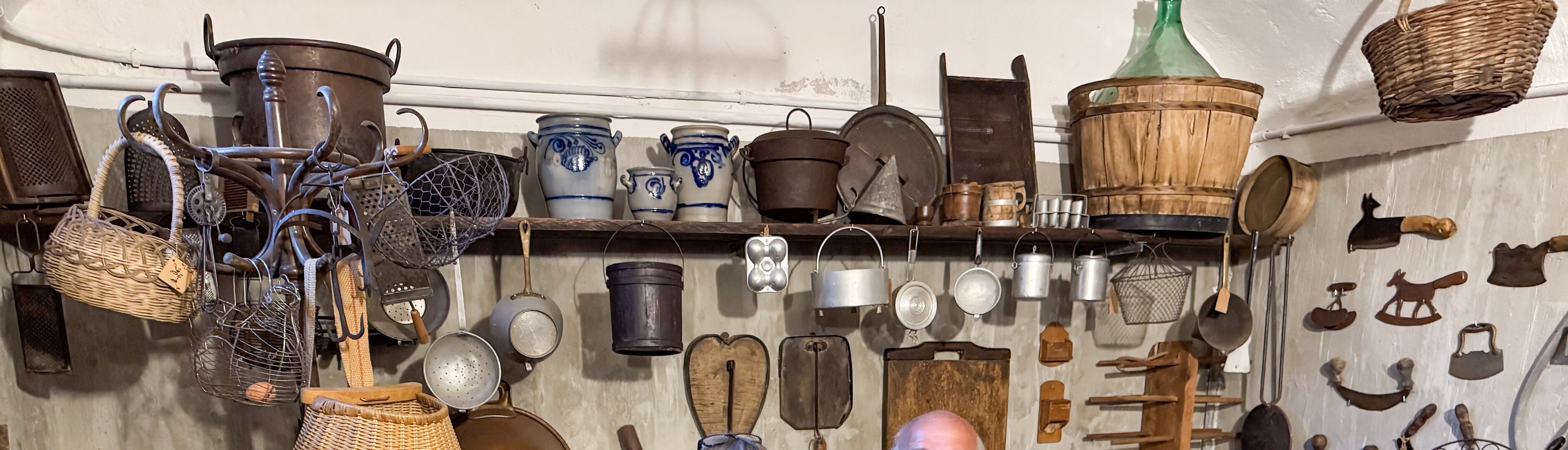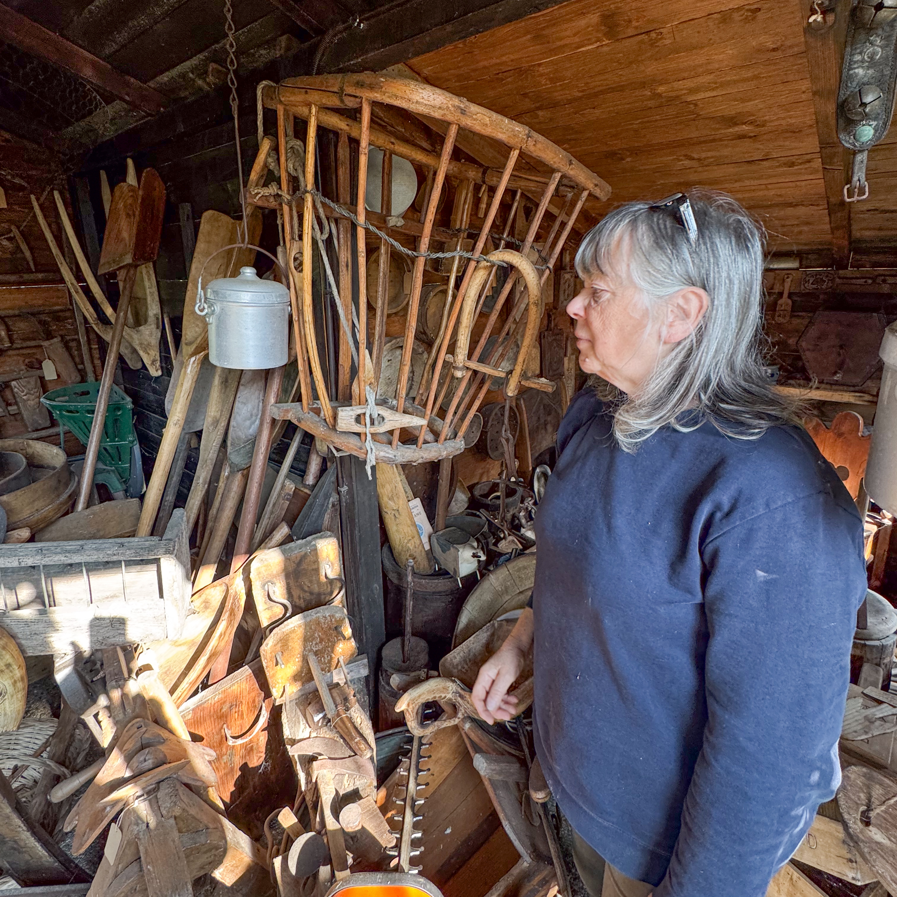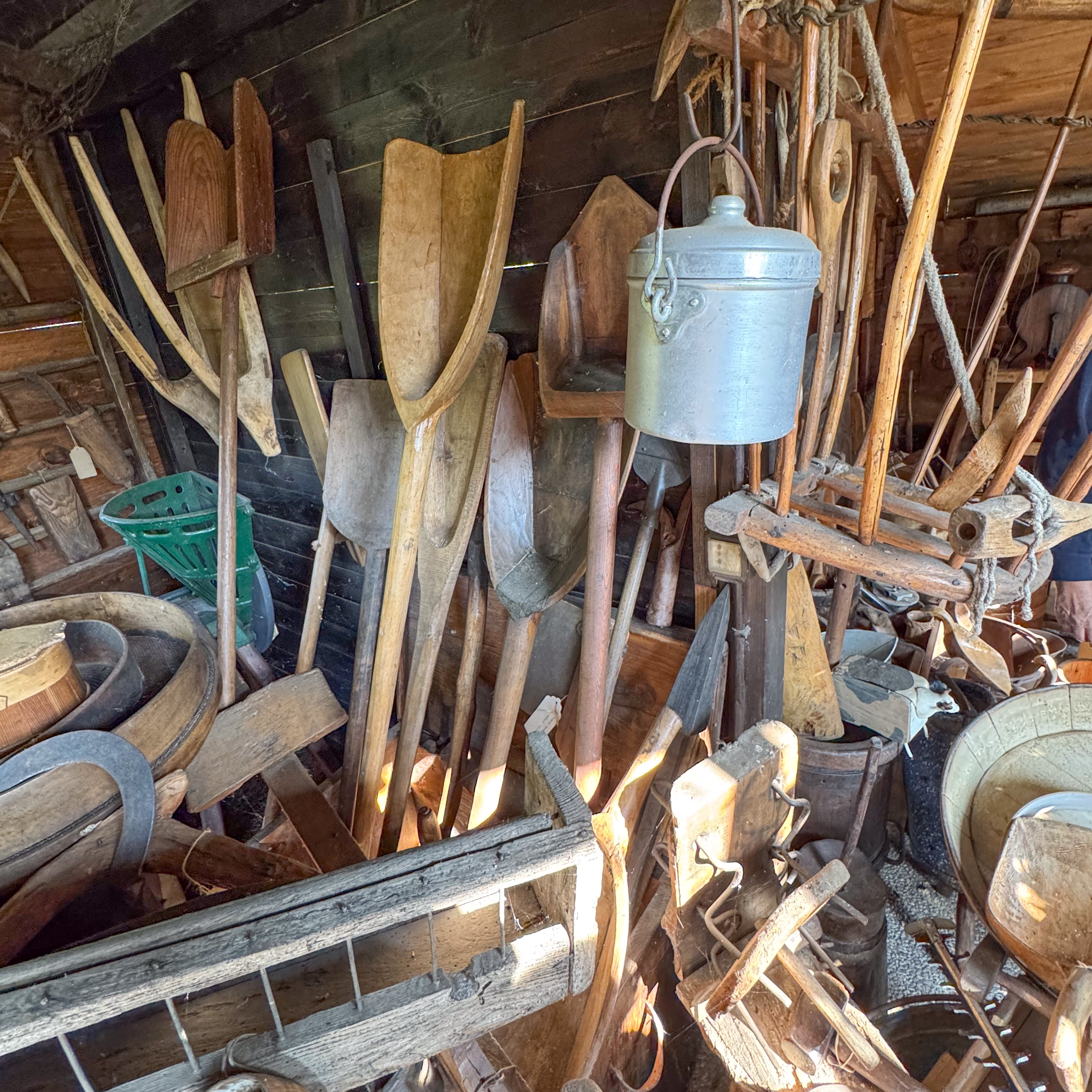 IMG 7850A toolshed, bedecked with tools. IMG 7851Pulleys and yokes IMG 7852A peek into the shed. IMG 7854The "basket" is a backpack for collecting hay in the mountains. IMG 7856There are many tools which were mysteries to us, but made perfect sense at the time they were used. A cheese form? IMG 7857 IMG 7858Washboards? IMG 7860More washboards. IMG 7861 IMG 7862Snowshoes IMG 7863Wood and leather working tools. IMG 7864 IMG 7865Shoemaker tools including "lasts". IMG 7866 IMG 7867Saws (above the window) IMG 7824Descending the stairs to the cellar past the chestnut pans. IMG 7825 IMG 7828The wine cellar IMG 7829A vessel made of wood and metal bands. IMG 7831Amusing wooden figurines. Food