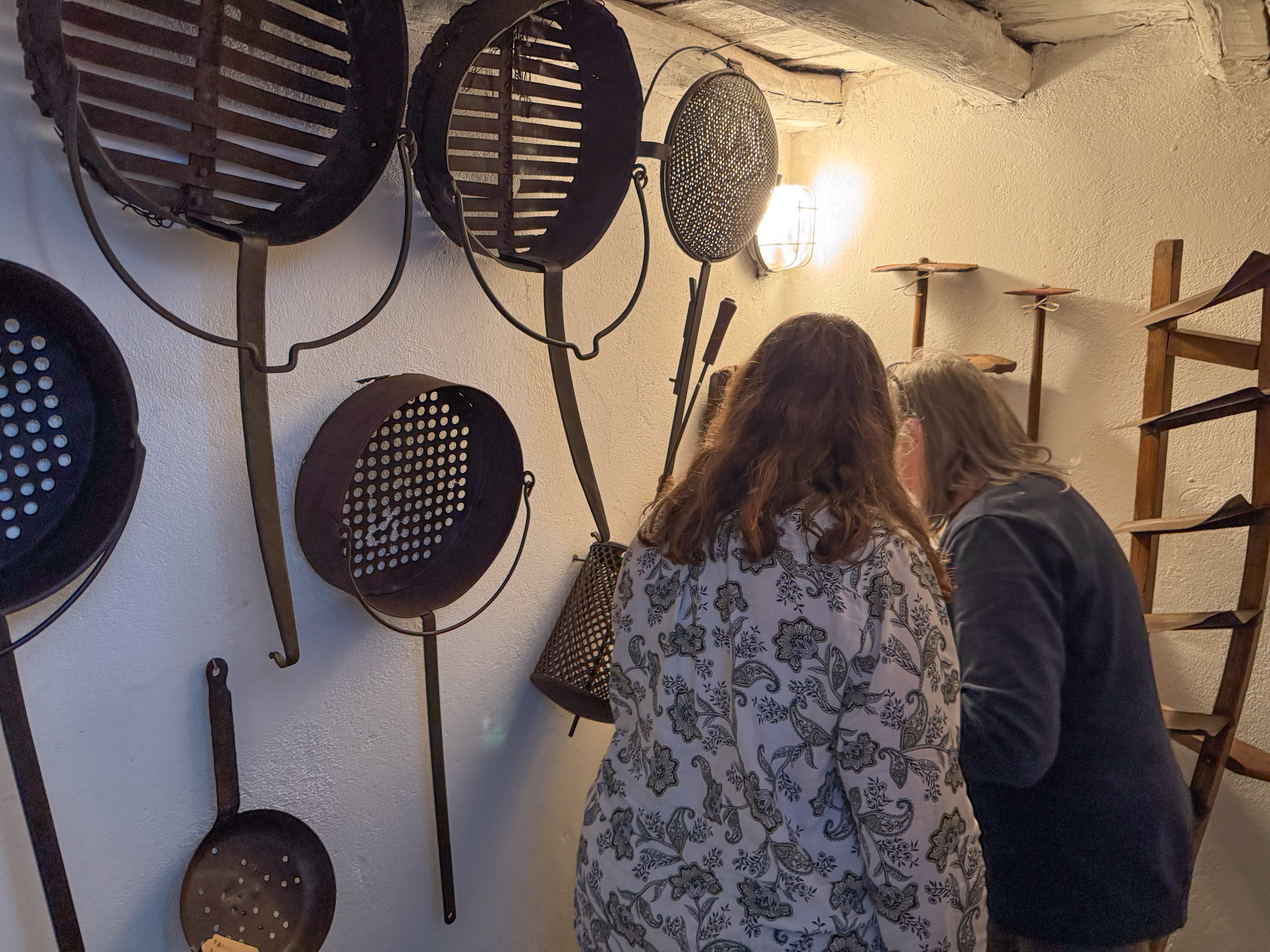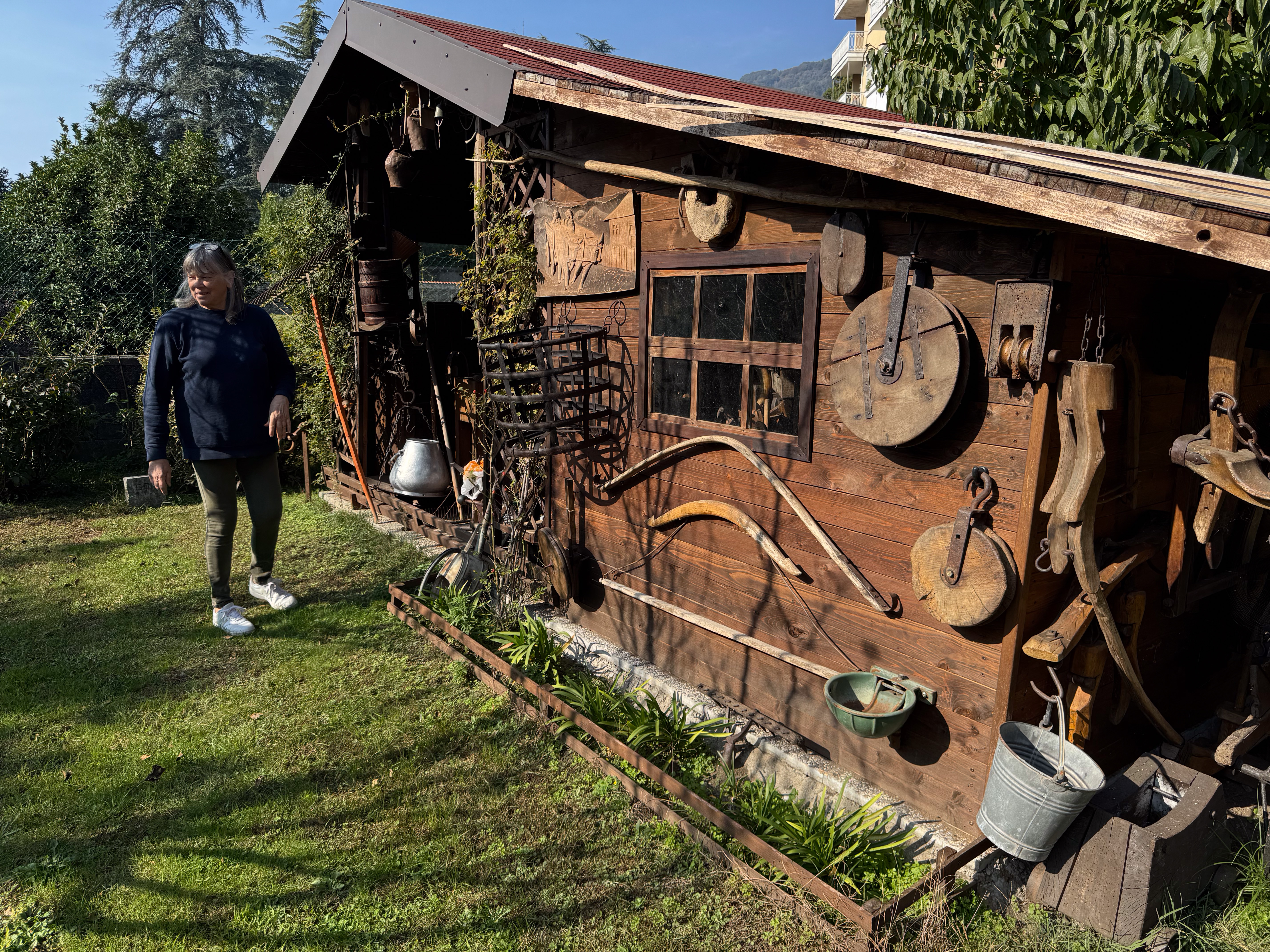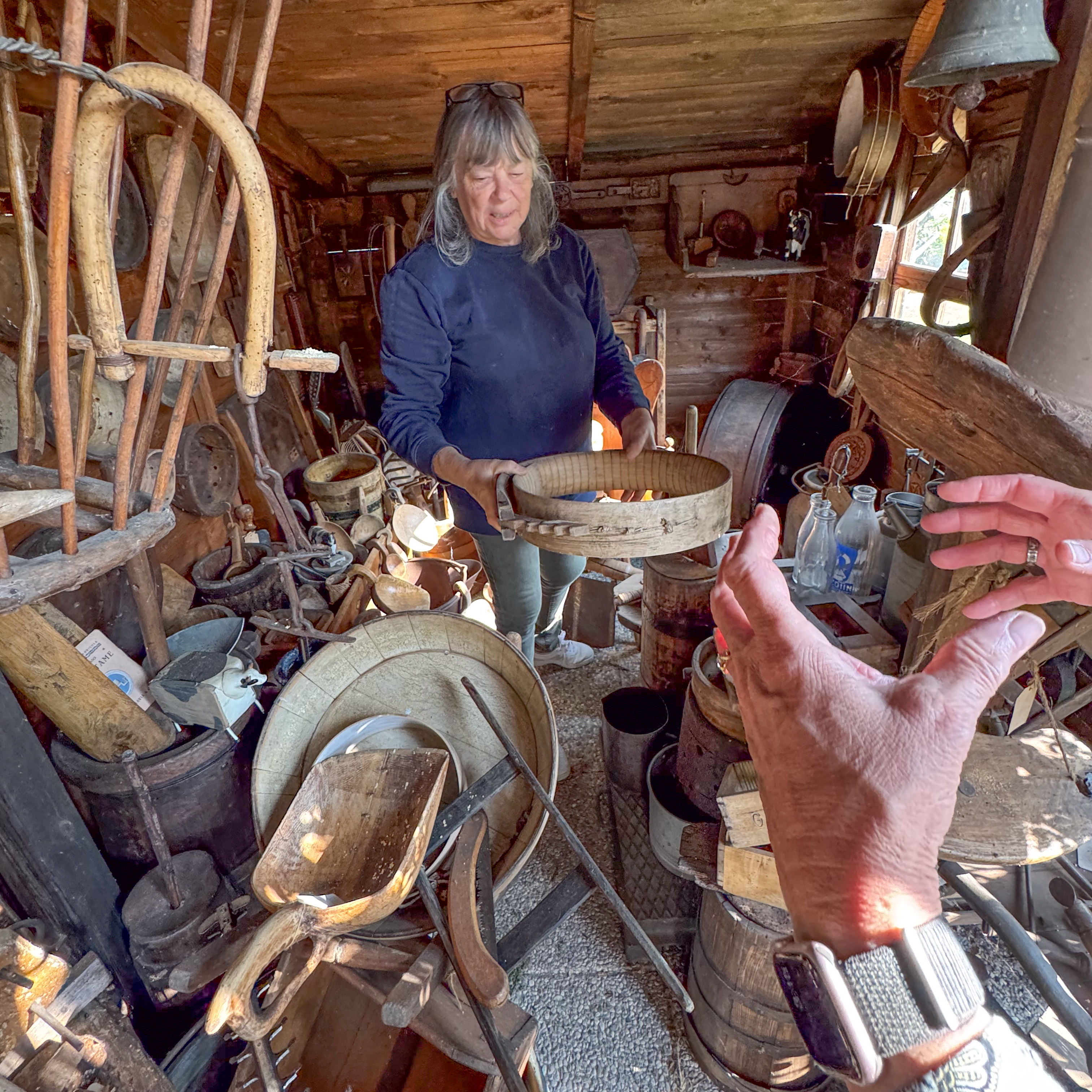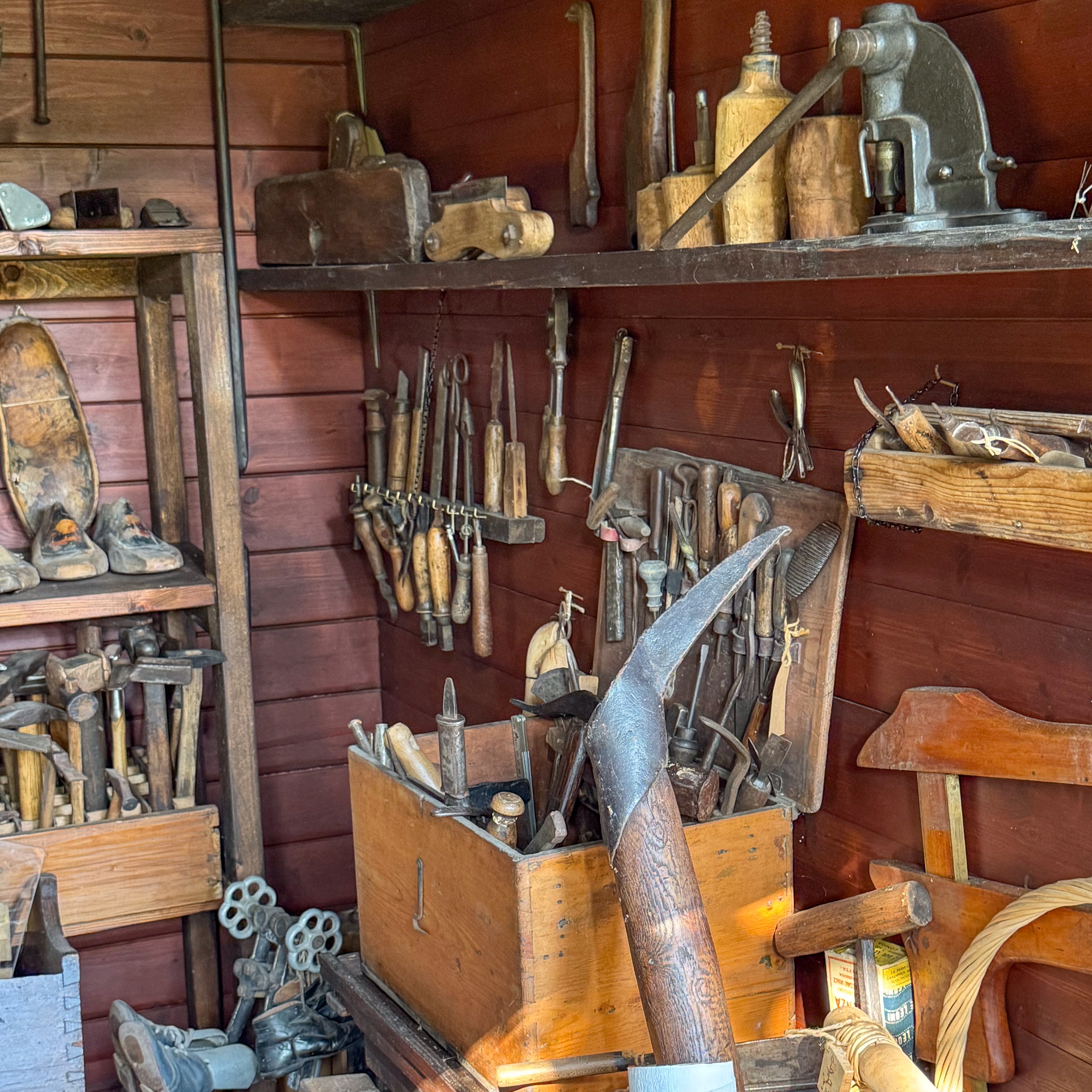 IMG 7850A toolshed, bedecked with tools. IMG 7851Pulleys and yokes IMG 7852A peek into the shed. IMG 7854The "basket" is a backpack for collecting hay in the mountains. IMG 7856There are many tools which were mysteries to us, but made perfect sense at the time they were used. A cheese form? IMG 7857 IMG 7858Washboards? IMG 7860More washboards. IMG 7861 IMG 7862Snowshoes IMG 7863Wood and leather working tools. IMG 7864 IMG 7865Shoemaker tools including "lasts". IMG 7866 IMG 7867Saws (above the window) IMG 7824Descending the stairs to the cellar past the chestnut pans. IMG 7825 IMG 7828The wine cellar IMG 7829A vessel made of wood and metal bands. IMG 7831Amusing wooden figurines. Food