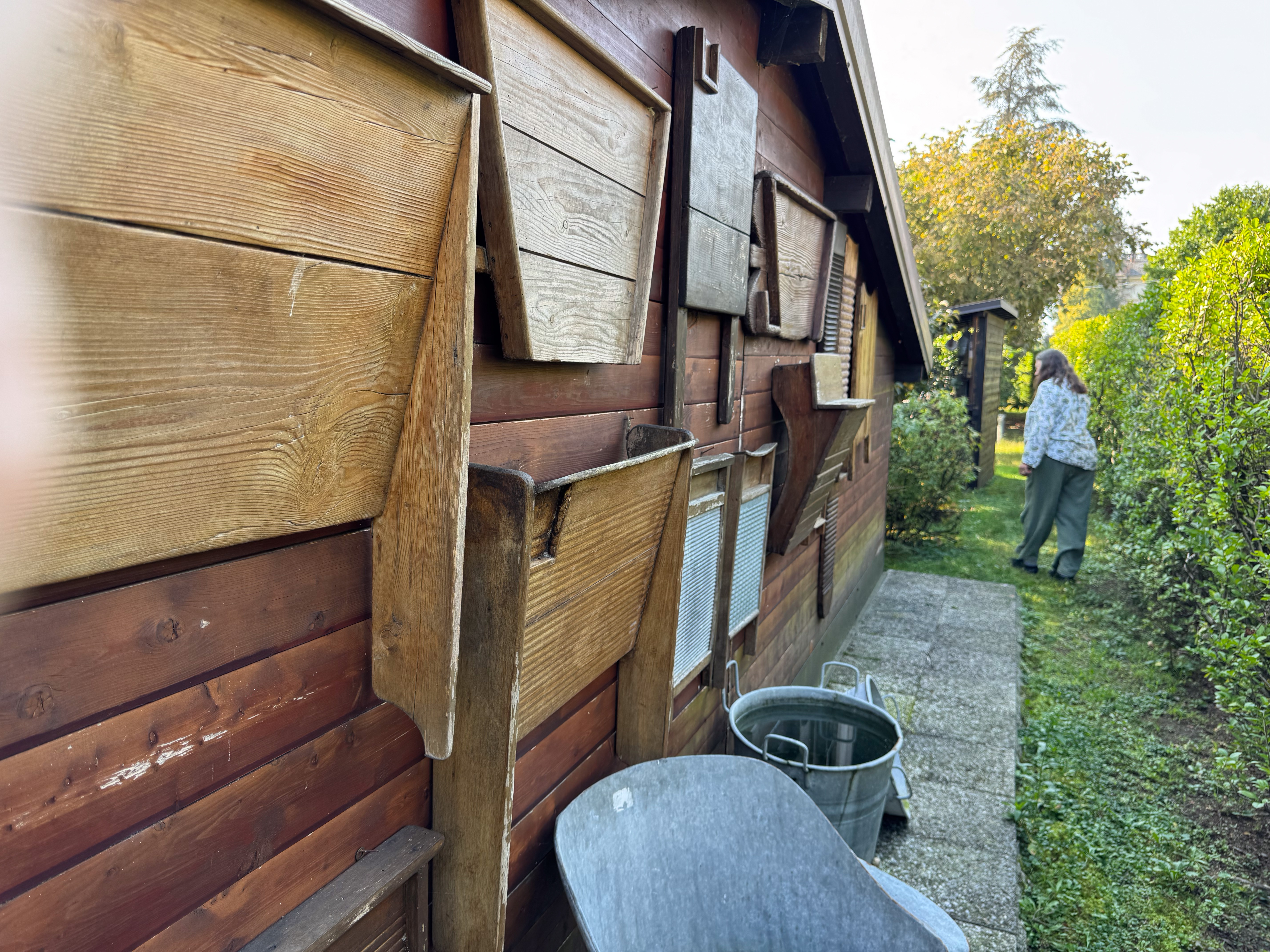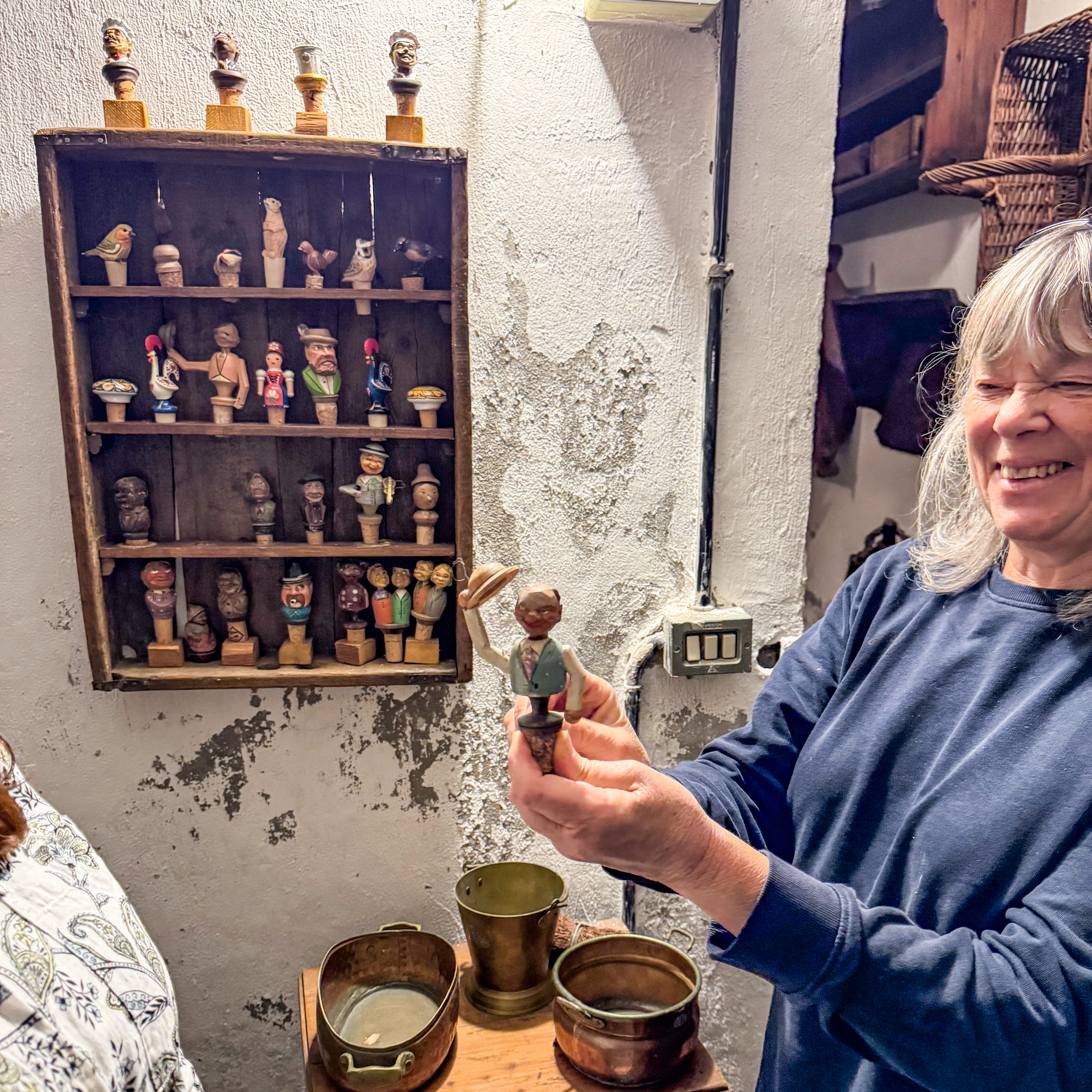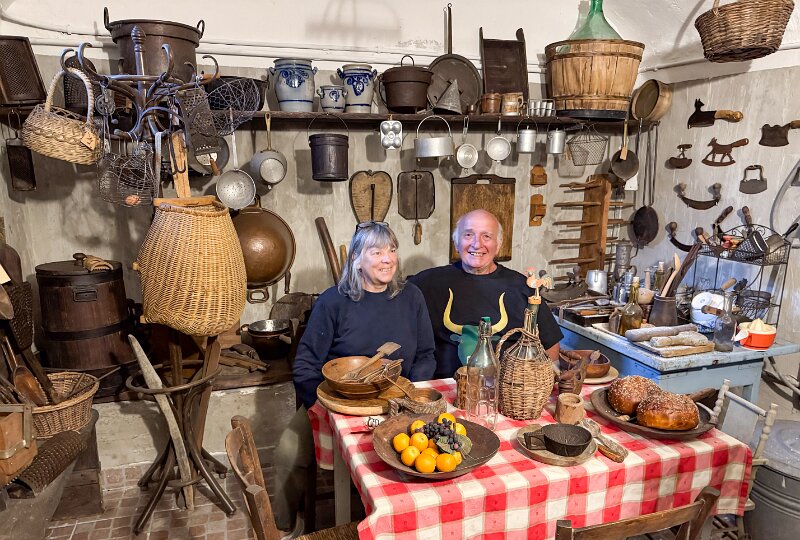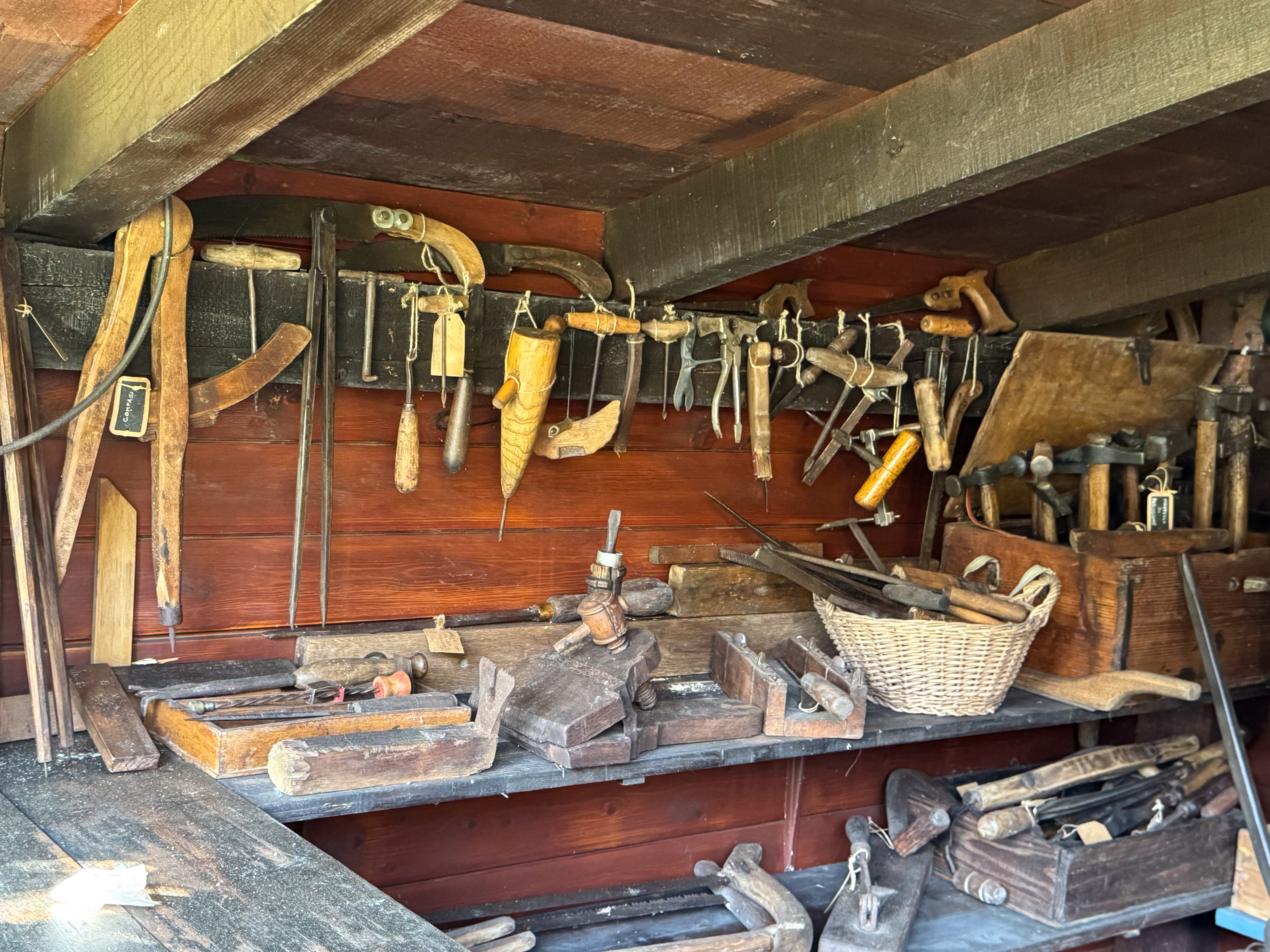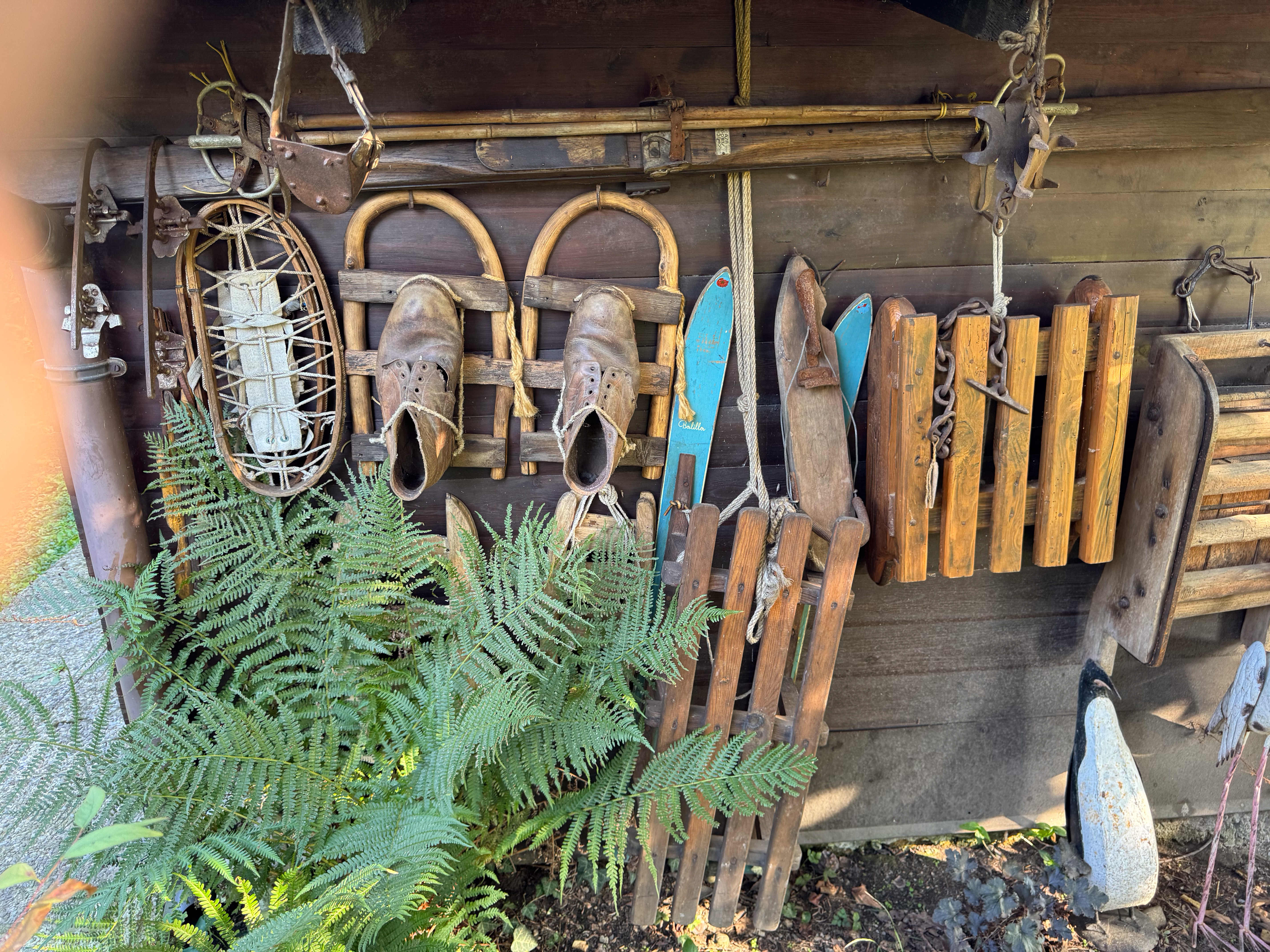 IMG 7850A toolshed, bedecked with tools. IMG 7851Pulleys and yokes IMG 7852A peek into the shed. IMG 7854The "basket" is a backpack for collecting hay in the mountains. IMG 7856There are many tools which were mysteries to us, but made perfect sense at the time they were used. A cheese form? IMG 7857 IMG 7858Washboards? IMG 7860More washboards. IMG 7861 IMG 7862Snowshoes IMG 7863Wood and leather working tools. IMG 7864 IMG 7865Shoemaker tools including "lasts". IMG 7866 IMG 7867Saws (above the window) IMG 7824Descending the stairs to the cellar past the chestnut pans. IMG 7825 IMG 7828The wine cellar IMG 7829A vessel made of wood and metal bands. IMG 7831Amusing wooden figurines. Food